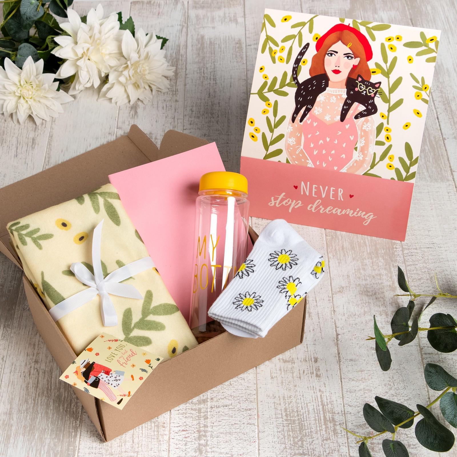 • Составляющие набора Блокнот, Бутылка, Носки, Открытка, Плед