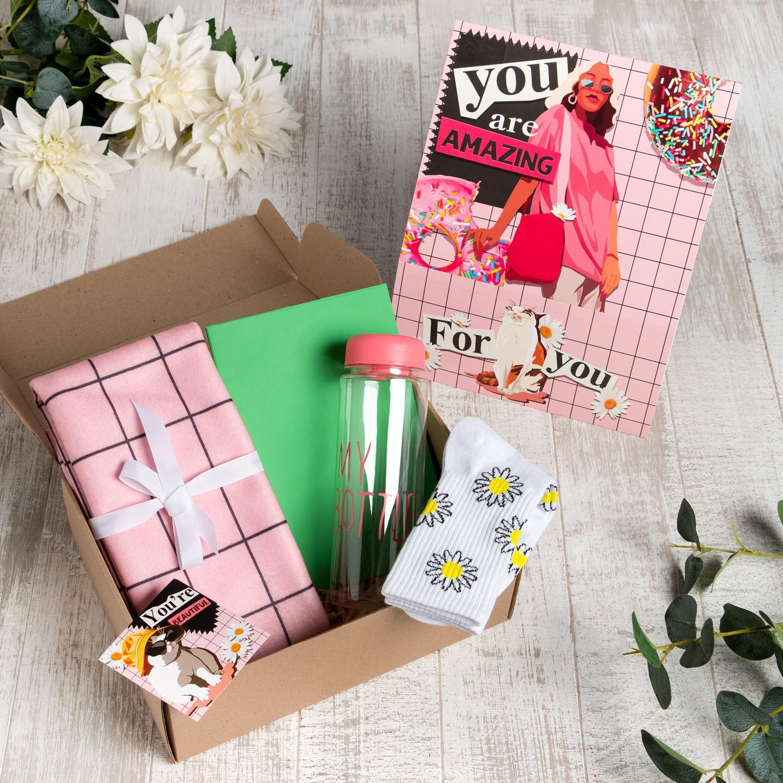 • Составляющие набора Блокнот, Бутылка, Носки, Открытка, Плед