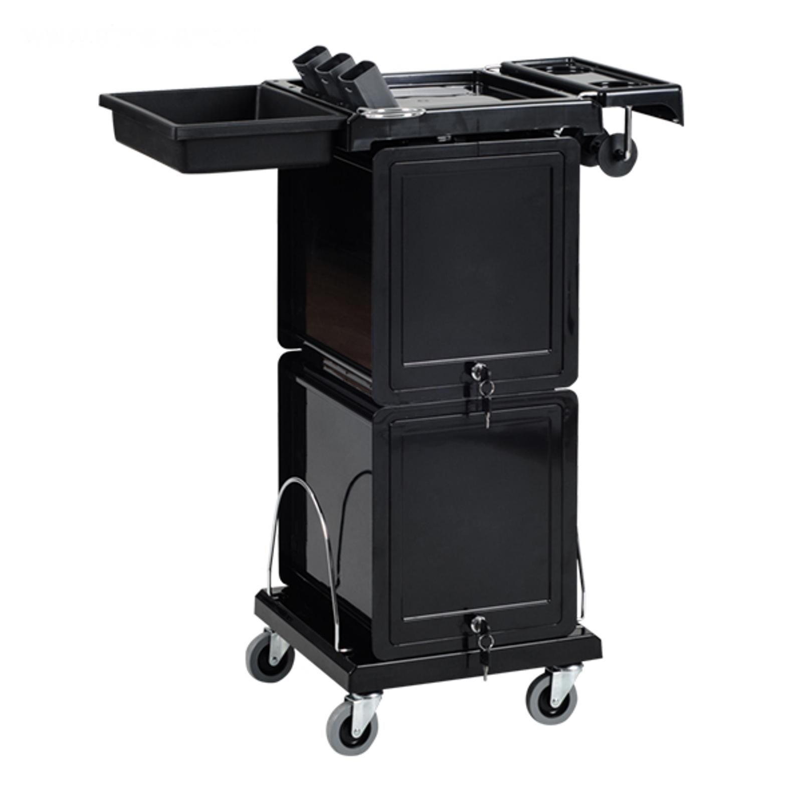 Парикмахерская тележка QA0013 выполнена из прочного металлического каркаса и пластика, устойчивого к воздействию красок. Столешница поделена на секции и имеет специальные стаканы для горячих ножниц и выпрямителей. Тележка оснащена внешним держателем для фена и креплением для фольги. Для хранения инструментов предусмотрены шесть выдвижных ящиков, которые можно зафиксировать на столешнице. Каждая секция оснащена замком. Хромированные бортики на нижней платформе надежно фиксируют бутыли.