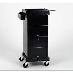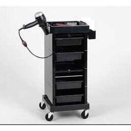 Парикмахерская тележка оборудована двумя секциями с выдвижными ящиками. Каждая секция запирается на ключ, что позволяет использовать одну тележку на два рабочих места. Столешница оборудована дополнительной съемной секцией для хранения инструментов и аксессуаров. К верхней части тележки можно прикрепить ящики, тем самым увеличив рабочую поверхность. Маневренные колеса обеспечивают бесшумное перемещение конструкции.