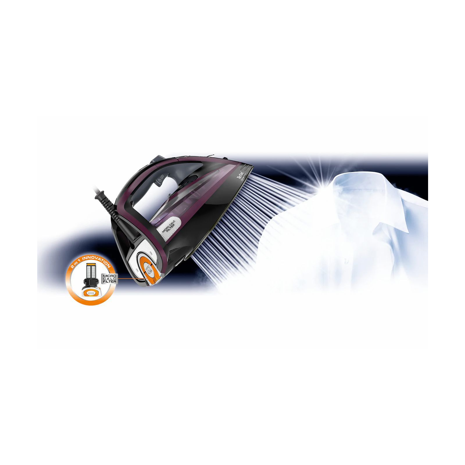 Праска Tefal ULTIMATE PURE FV9835E0. Праска Tefal Ultimate Pure Steam Iron поєднує приголомшливу парову потужність з ексклюзивною системою проти накипу для ідеального прасування. Абсолютно нова ексклюзивна технологія Micro-Calc Filter допомагає запобігти залишкам або плямам від накипу під час прасування, тоді як постійна потужність пари 55 г/хв забезпечує максимальну ефективність, а надпотужний паровий удар 240 г/хв впорається навіть із найстійкішими складками.