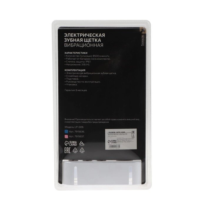 Электрическая зубная щётка Luazon LP-009, вибрационная, 8500 дв/мин, 4 насадки, 2хАА, синяя