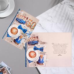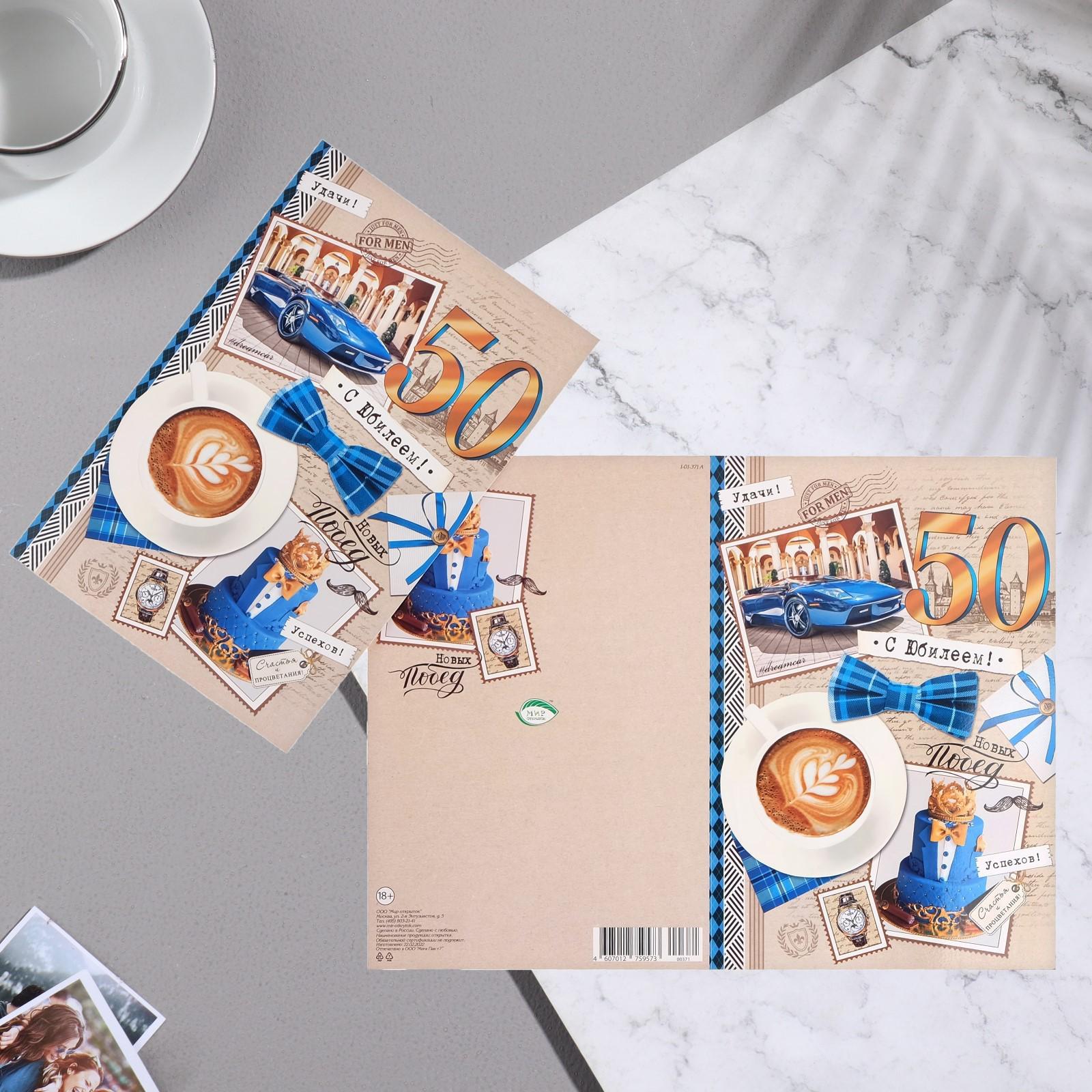 Открытка "С Юбилеем 50!" тиснение, конгрев, машина, кофе, 18,5 х 29 см