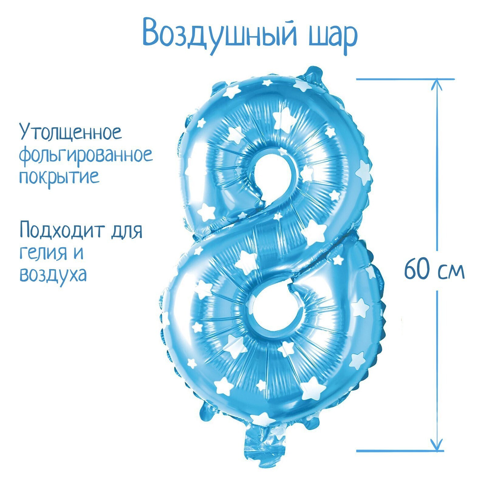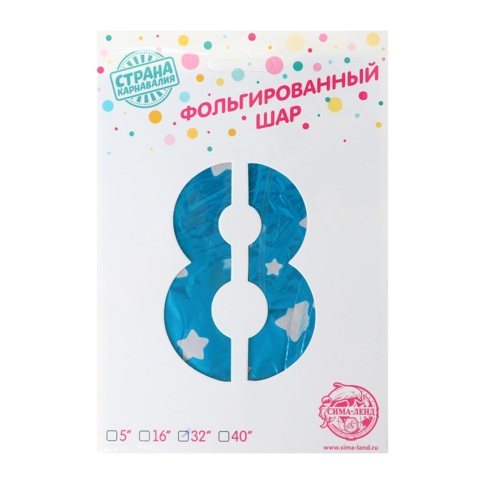 Шар фольгированный 32", цифра 8, звёзды, индивидуальная упаковка, цвет голубой