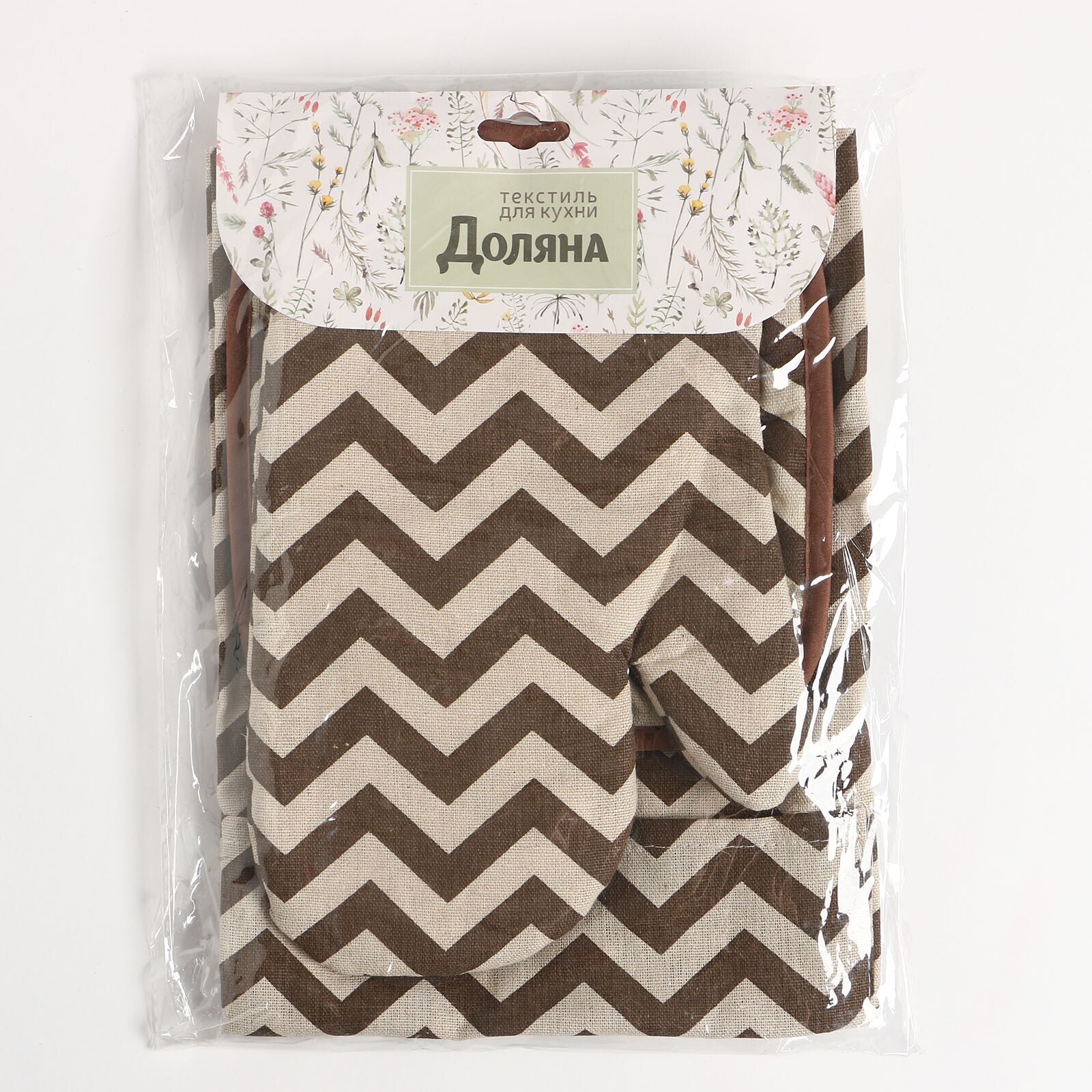 Набор Доляна фартук/прихватка/варежка, Зигзаг коричневый, 100%пэ, рогожка 200 гр/м