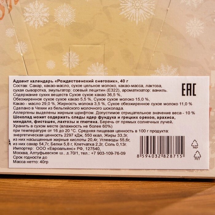 Адвент календарь Fikar "Рождественский снеговик", 40 г