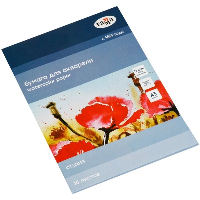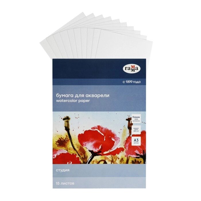 Бумага для акварели в папке А3, 15 листов, Гамма "Студия", 200 г/м2, среднее зерно