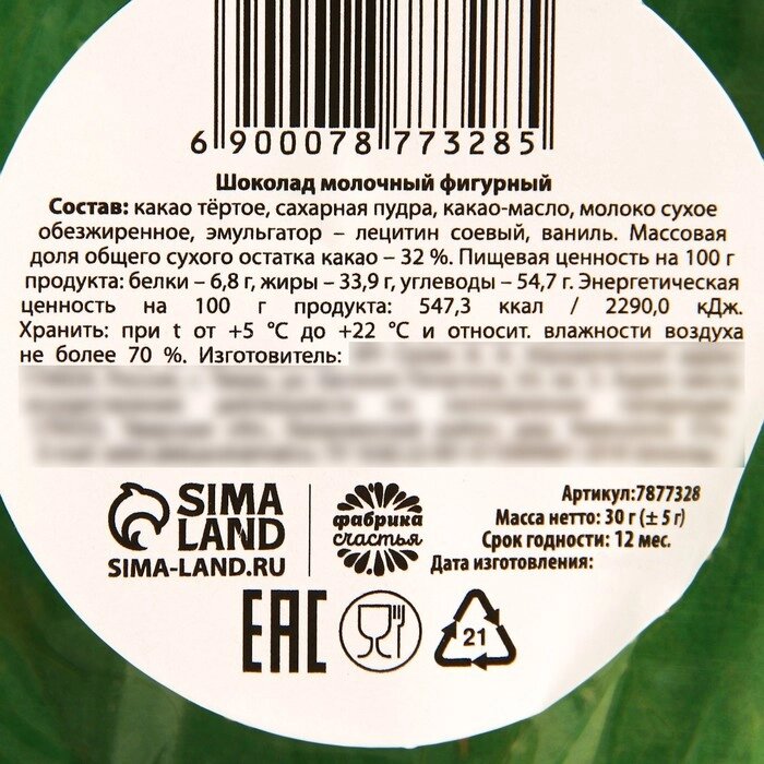 • Вид шоколада Молочный