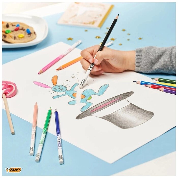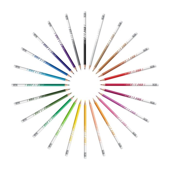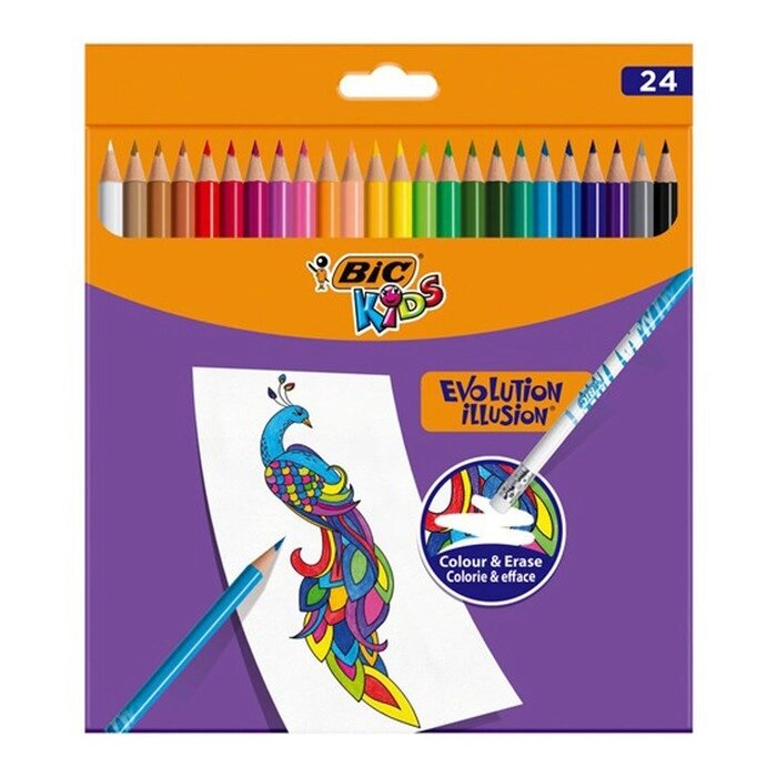 Карандаши 24 цвета, круглые, BIC Kids Evolution Illusion, пластиковые, стираемые, премиум, ударопрочный грифель 2.8 мм,