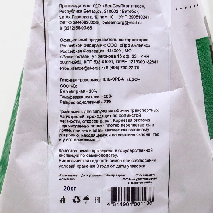 Газонная травосмесь "Для залуживания откосов (ДЗО)20 кг