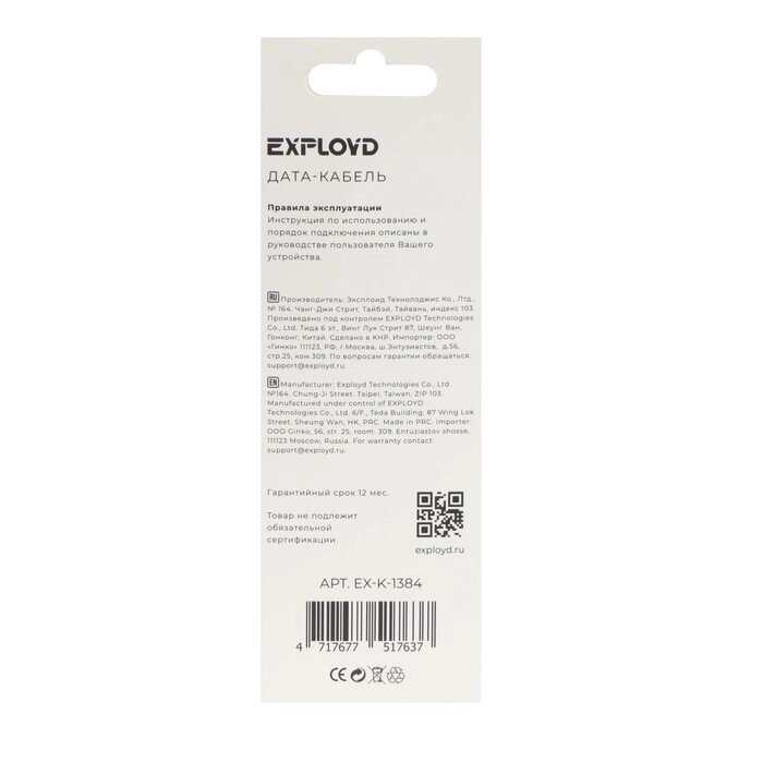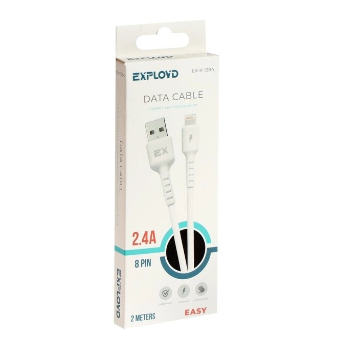 Кабель Exployd EX-K-1384, Lightning - USB, 2.4 А, 2 м, силиконовая оплетка, белый