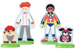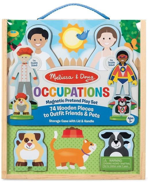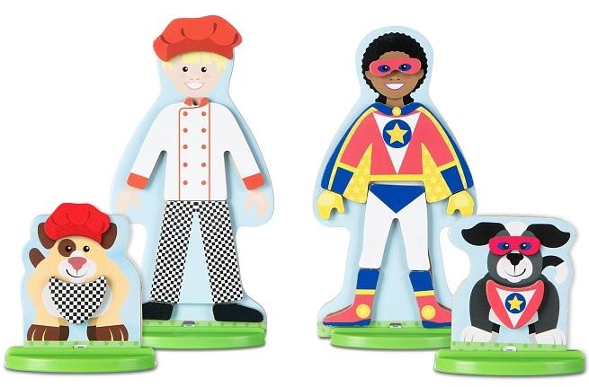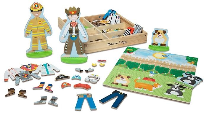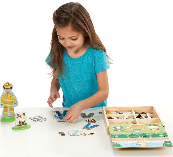Комбінуйте десятки дерев'яних магнітних фігур в узгоджених дизайнах, щоб одягнути двосторонніх друзів і їх собак! Комбінуйте дерев'яні магнітні одягу та аксесуари, щоб підготувати персонажів до роботи або пригод (доктор, кухар, астронавт, будівельник, супергерой, пірат, лицар, ковбой / пастушка, пожежний, поліцейський). Ігрові фігурки, кожна з яких має міцну підставку для удаваною гри, і магніти зберігаються в міцному дерев'яному підносі з висувною кришкою і зручною ручкою для перенесення, щоб розважитися на ходу! Цей унікальний набір ляльок-одевалок допомагає дітям від трьох років і старше розвивати координацію рук і очей і навички дрібної моторики, рахунки і сортування, а також заохочує творче самовираження і творчу гру.