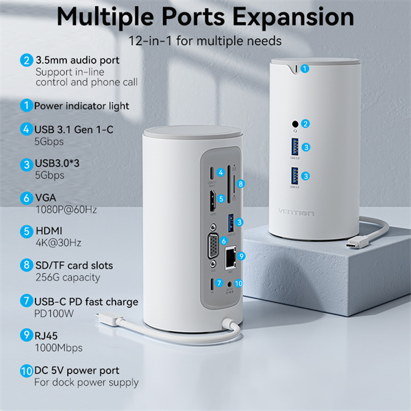 СовместимостьТип разъема USB-C/HDMI/VGA/USB 3.1 Gen 1-C/USB 3.0x3/RJ45/SD/TF/TRRS 3.5mm/PD/DC