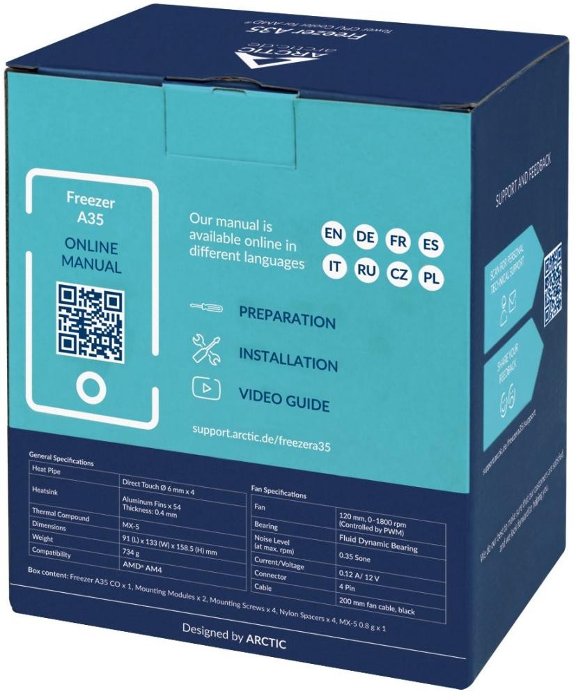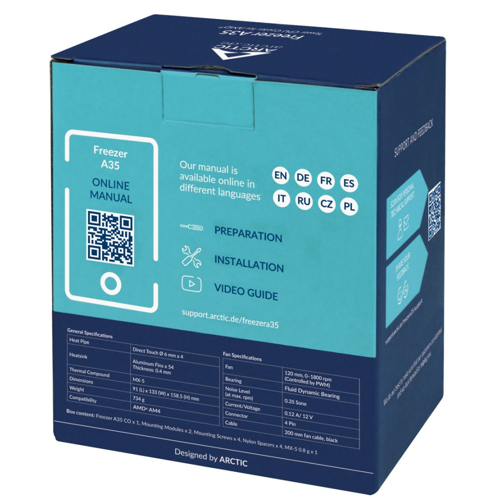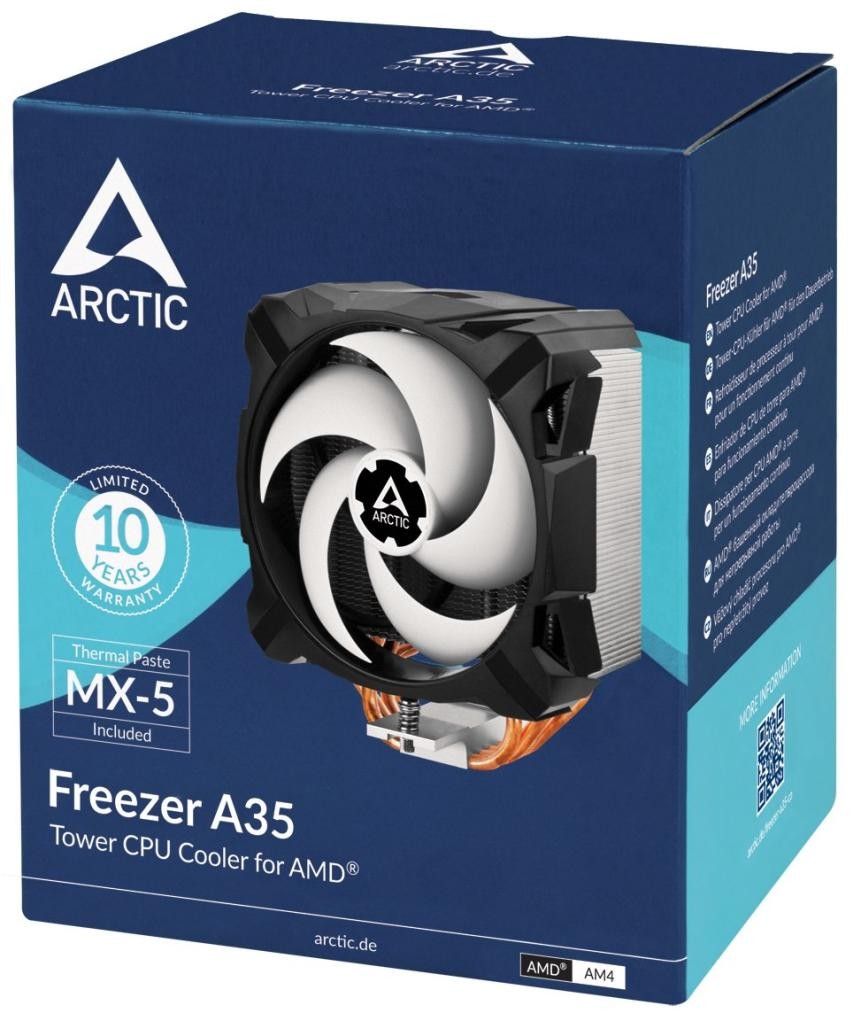 Arctic Freezer A35 — високопродуктивний процесорний кулер. Призначений для охолодження процесора AMD під сокет AM4. Для розсіювання тепла із радіатора використовується вентилятор. Вентилятор має широкі лопаті, які здатні захопити велику кількість повітря. За одну хвилину виріб виконує до 1800 обертів . Підключається пристрій за допомогою конектора 4 Pin . Виріб підійде для всіх вказаних сокетів.