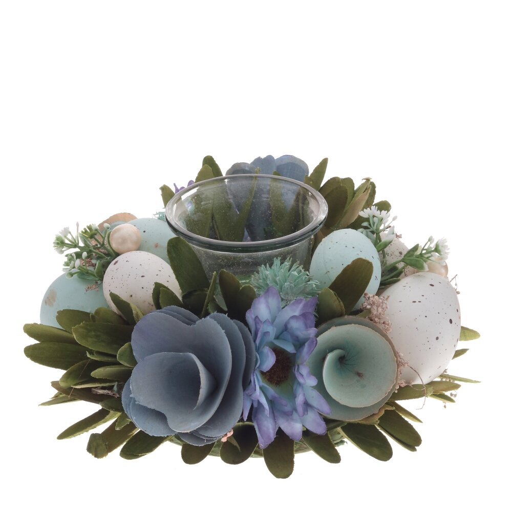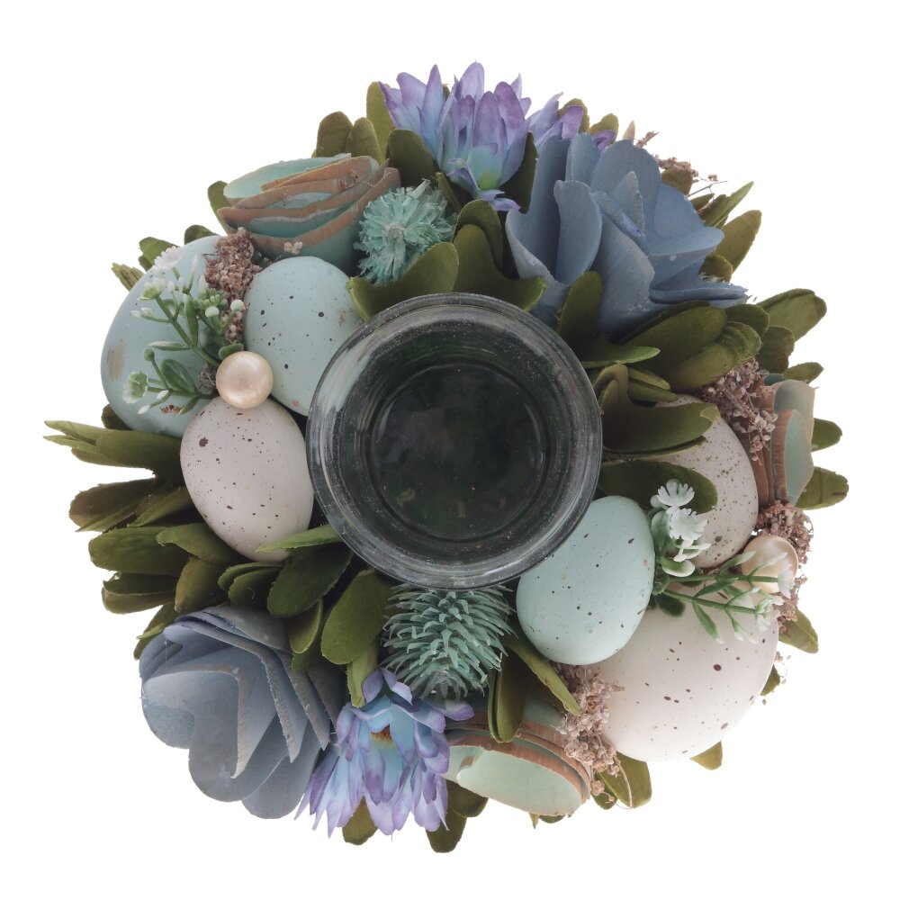 Пасхальный праздничный подсвечник выполнен в виде венка из искусственных цветов и яиц. Для установки свечи предусмотрена вставка из прозрачного стекла. Такая красивая композиция подчеркнет ваш интерьер, послужит чудесным, душевным подарком для родных и близких. Привнесет в ваш дом первую весеннюю свежесть листвы и солнечное тепло, создаст атмосферу пробуждения природы. В вашем доме навсегда поселится весна, тепло и уют.
