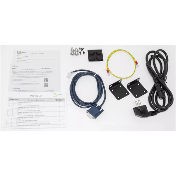 Комплект поставкиКоммутатор; Кабель питания; Разъем DC питания; Консольный кабель; Кабель заземления; Крепления в стойку (2 шт.); Резиновые ножки (4 шт.); Набор болтов; Руководство по установке; Гарантийный талон.