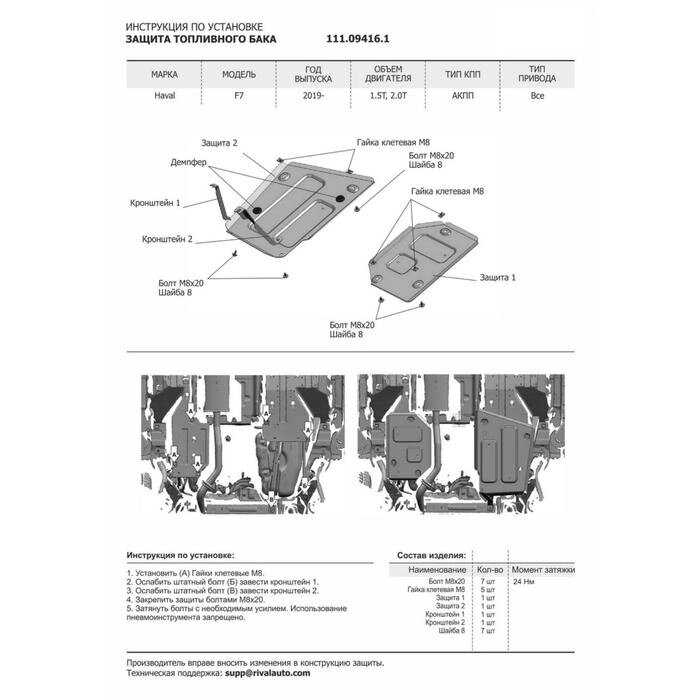 Защита топливного бака АвтоБРОНЯ для Haval F7 (V - 1.5T; 2.0T) 2019-н. в., сталь 1.5 мм, с крепежом, 111.09416.1