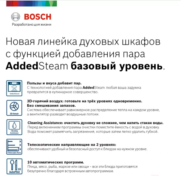 Режимы нагреванижний + верхний нагрев, режим для пиццы, быстрый разогрев, гриль + конвекция, 3D горячий воздух, Vario-гриль, горячий воздух gentle, 3D горячий воздух +, нижний жар