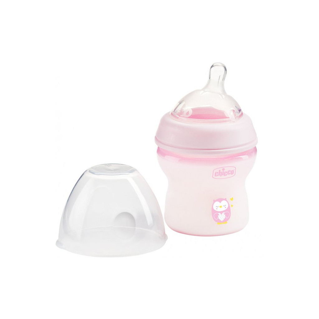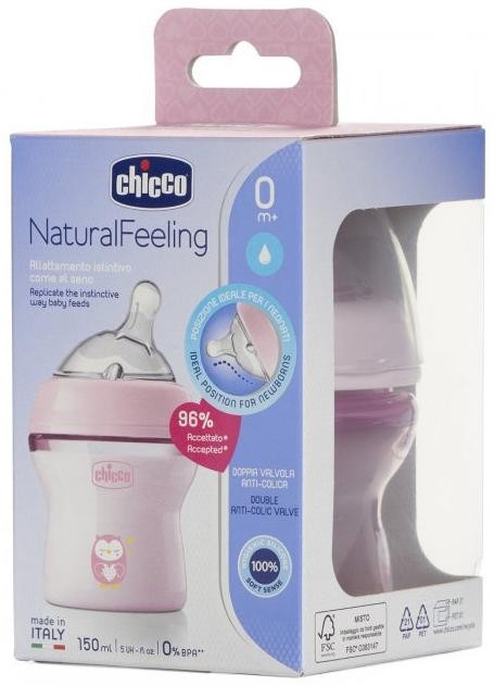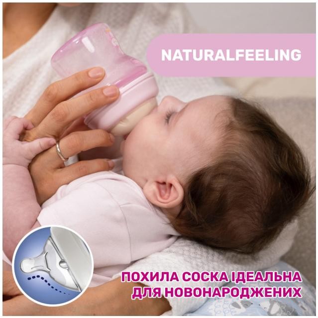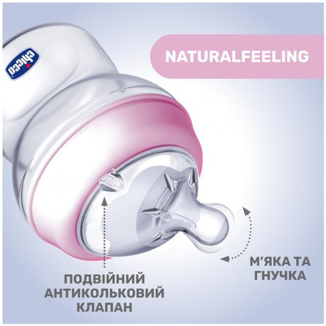 Пластикова пляшка Chicco Natural Feeling з похилою силіконовою соскою, яка завжди наповнена молоком, сприяє імітації природного вигодовування.