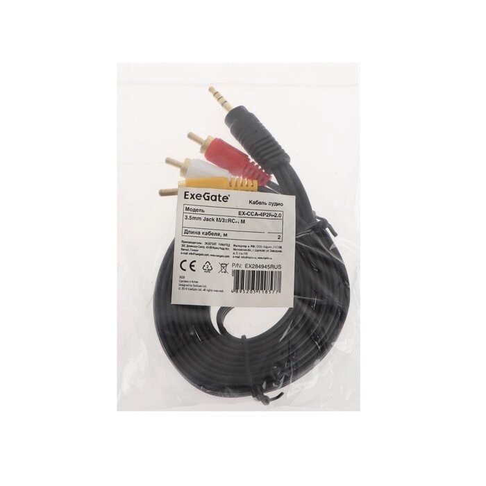 Кабель-переходник аудио ExeGate EX-CCA-4P2R-2.0, Jack 3.5 мм (m)-3xRCA (m), 2 м, черный