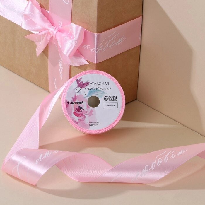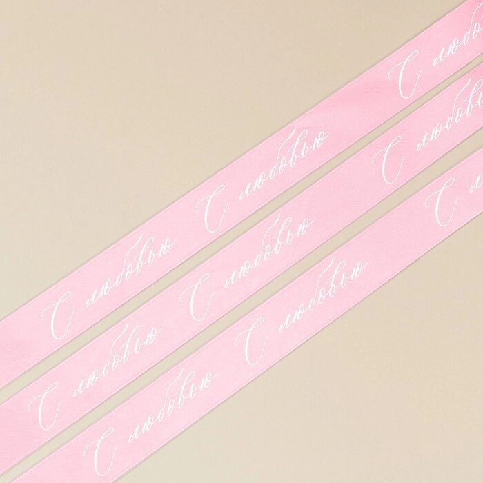 Лента атласная "С любовью", розовая, 4 см 5 метров