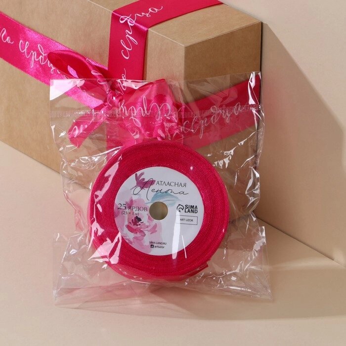 Лента атласная "От всего сердца", розовая, 4 см 25 ярдов (22,5 м)
