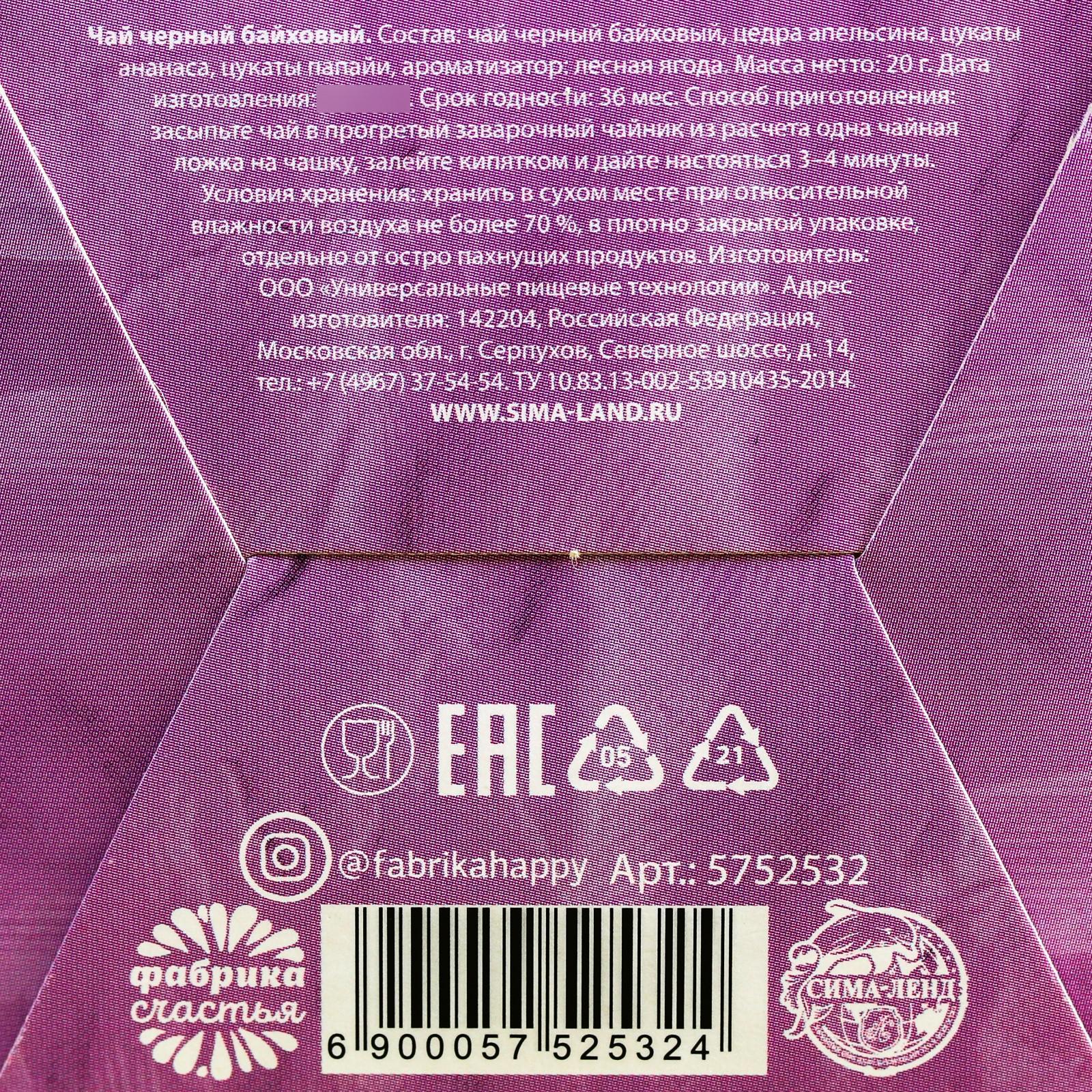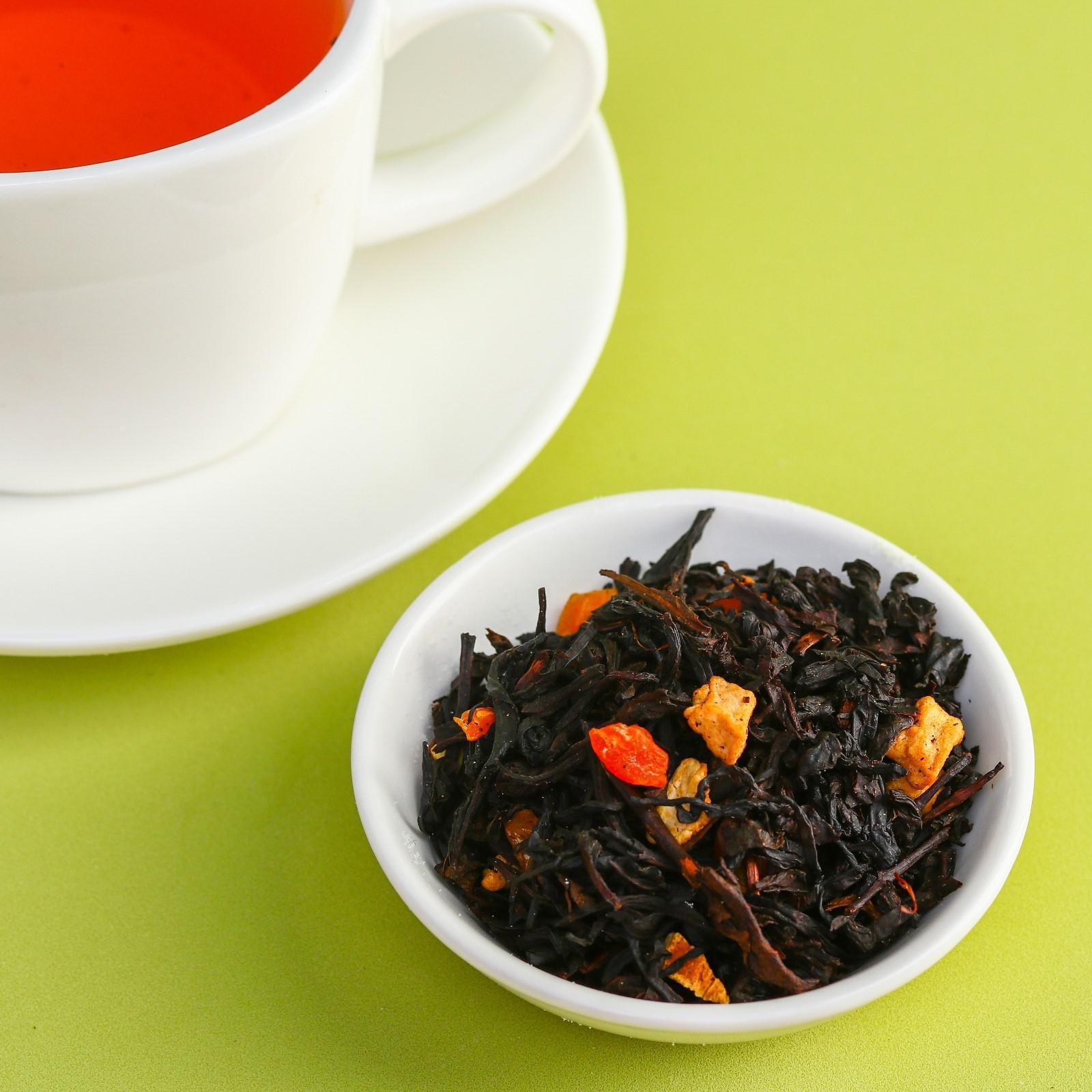 Состав: чай черный байховый, цедра апельсина, цукаты ананаса, цукаты папайи, ароматизатор: лесная ягода.