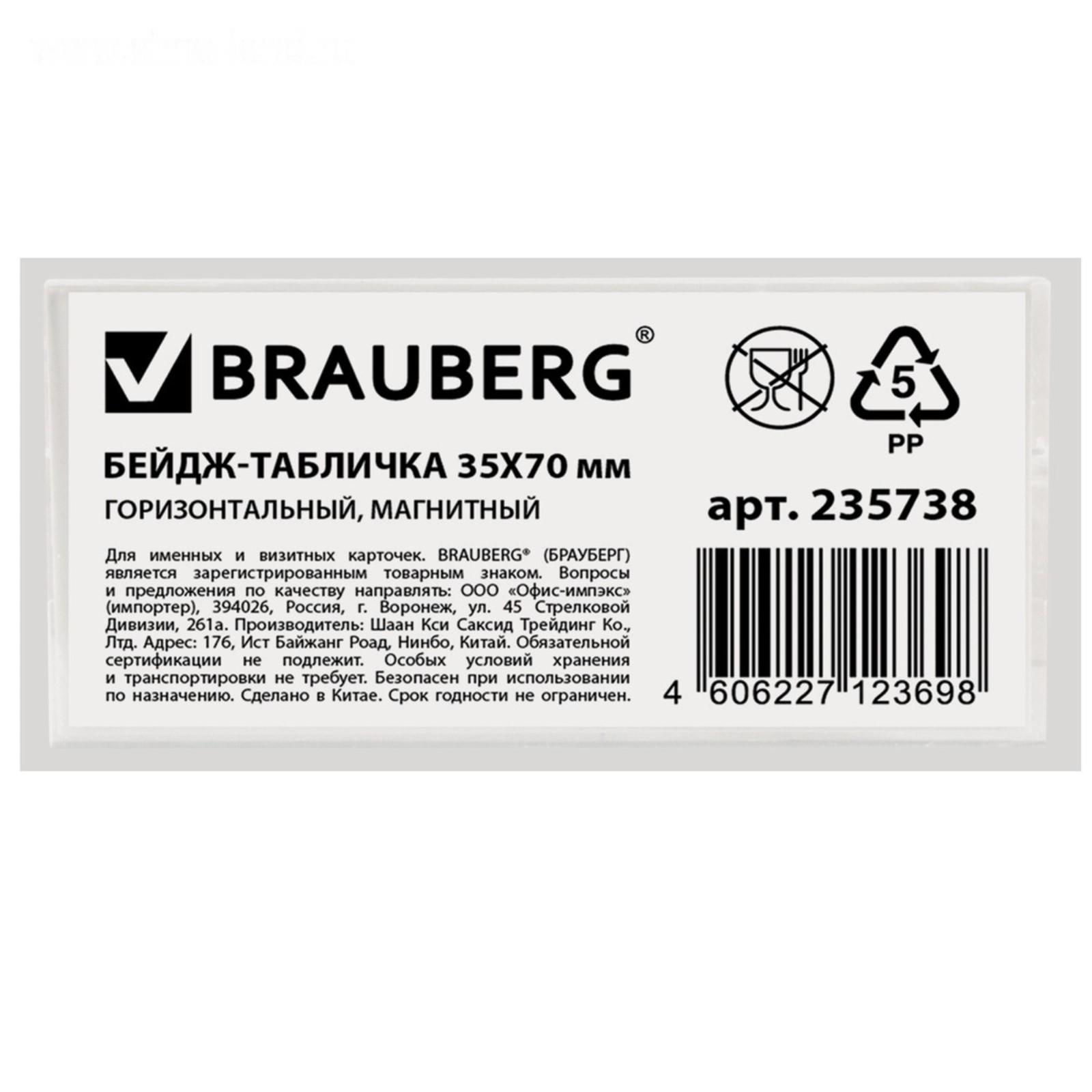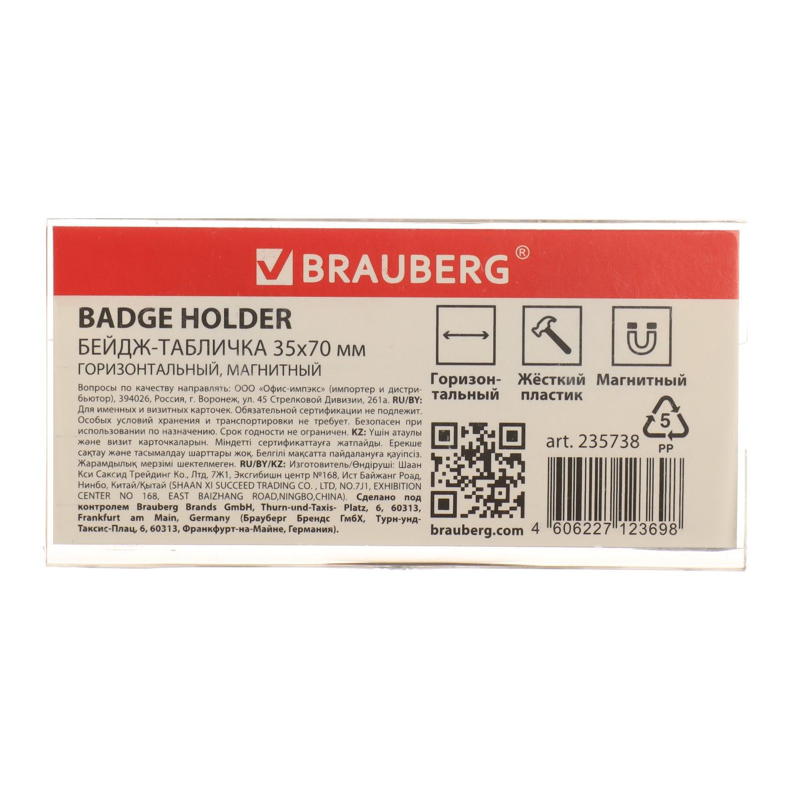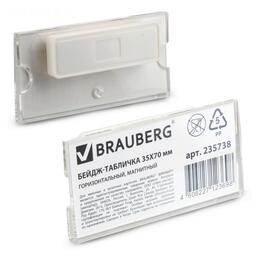 Горизонтальный бейдж-табличка BRAUBERG для именных карточек. Твердый пластик гарантирует долгий срок службы. Будет незаменим для сотрудников гостинично-ресторанного сектора. Закрепляется магнитом. Защитит Вашу одежду от необходимости в мелких проколах булавкой. Размер вкладыша - 70х35 мм.
