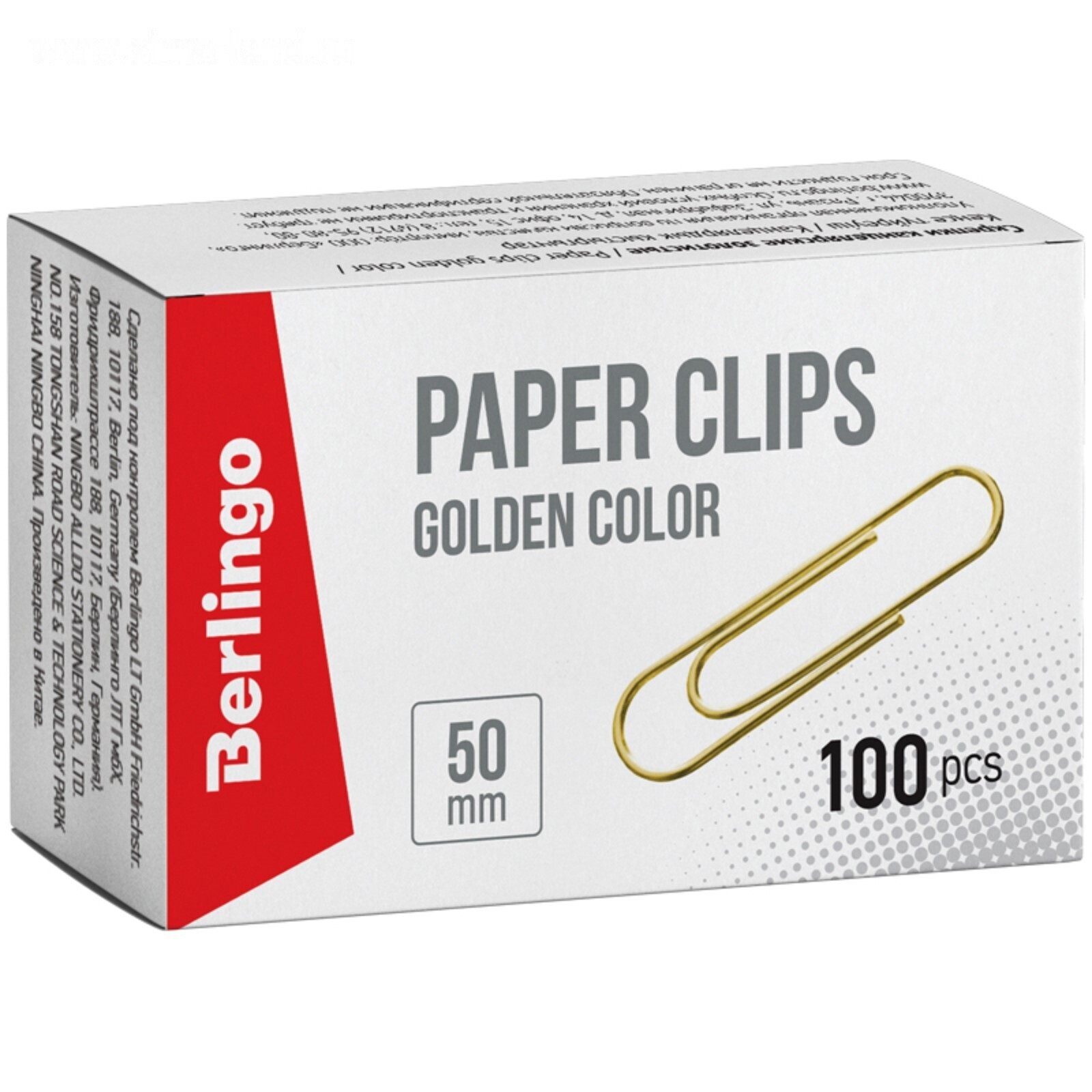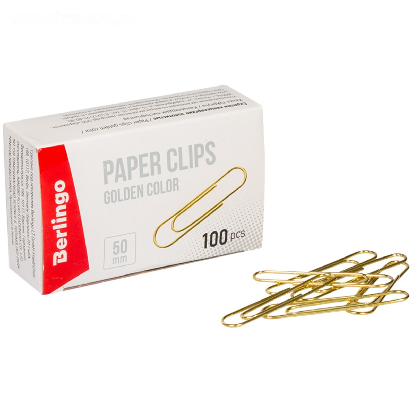 Скрепки канцелярские 50мм, золотистые 100 штук Berlingo, в картонной упаковке