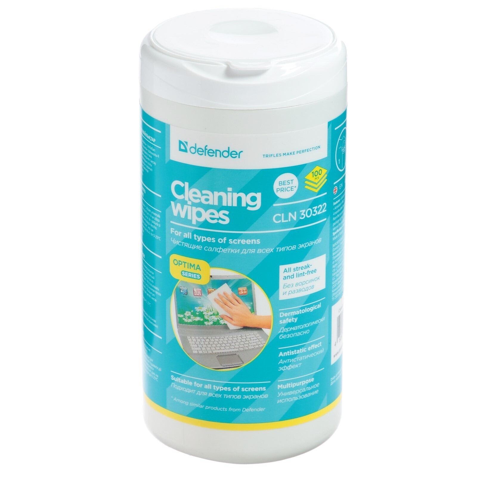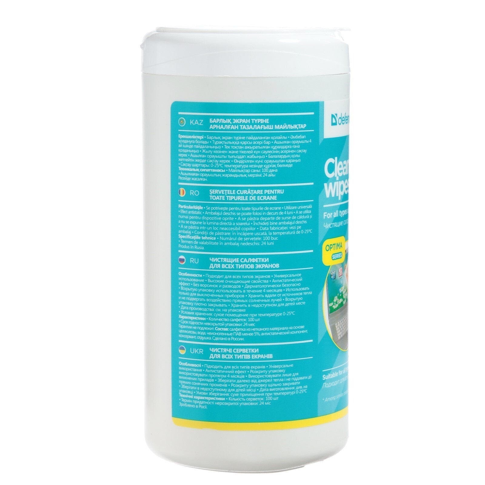 Салфетки чистящие для всех типов экранов, Defender Cleaning wipes, Optima, 100 штук в тубе