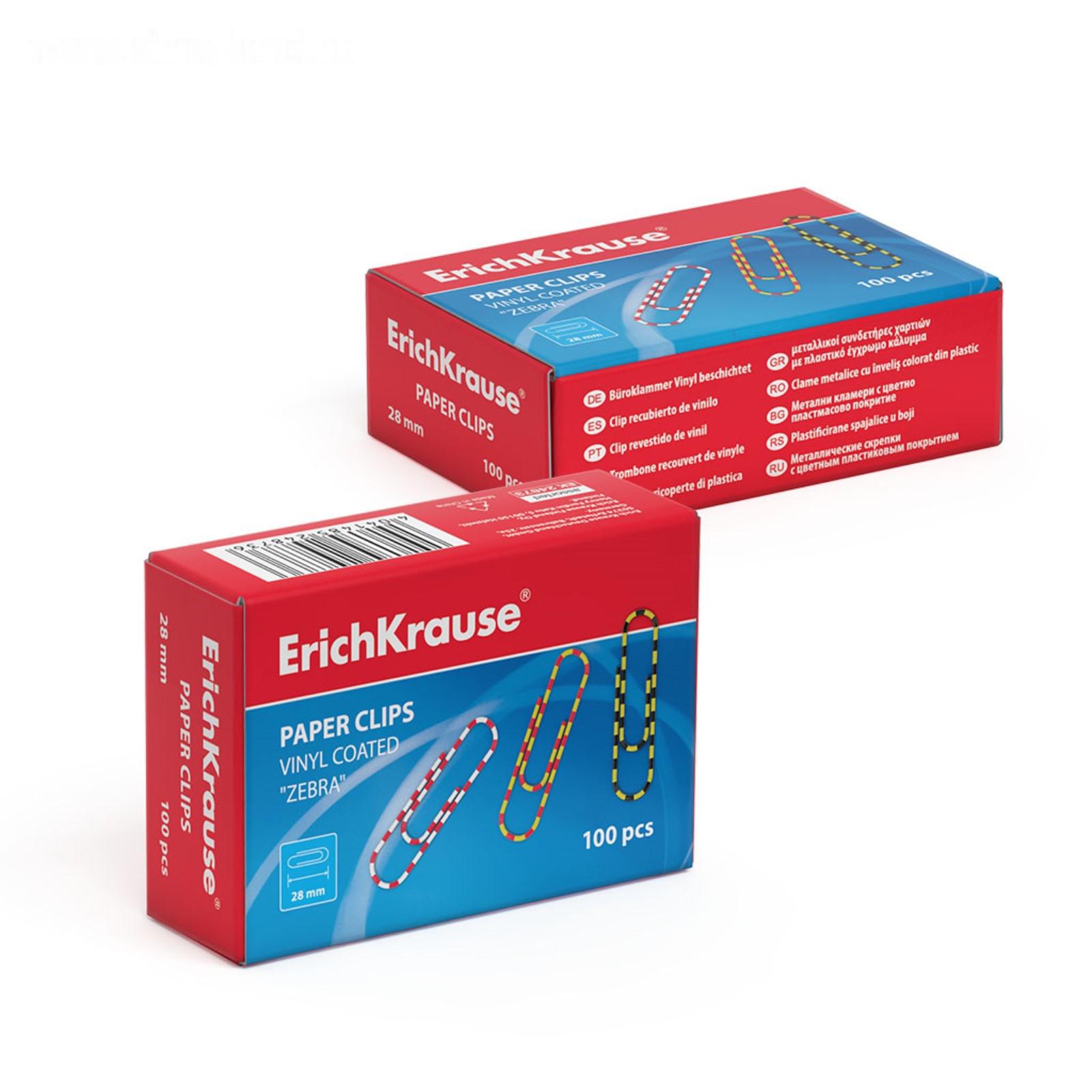 Скрепки канцелярские 28мм, 100шт, цветные с виниловым покрытием "Зебра", Erich Krause, картонная упаковка