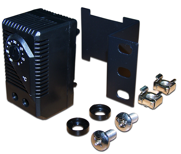 Дополнительная информацияТемпература задается пользователем с помощью поворотного регулятора на корпусе термостата. Датчик температуры находится внутри корпуса. Термостат необходимо подключать в разрыв сети электропитания вентиляторной панели. Прибор устанавливается в телекоммуникационный шкаф на кронштейн высотой 1U, входящий в комплект поставки.