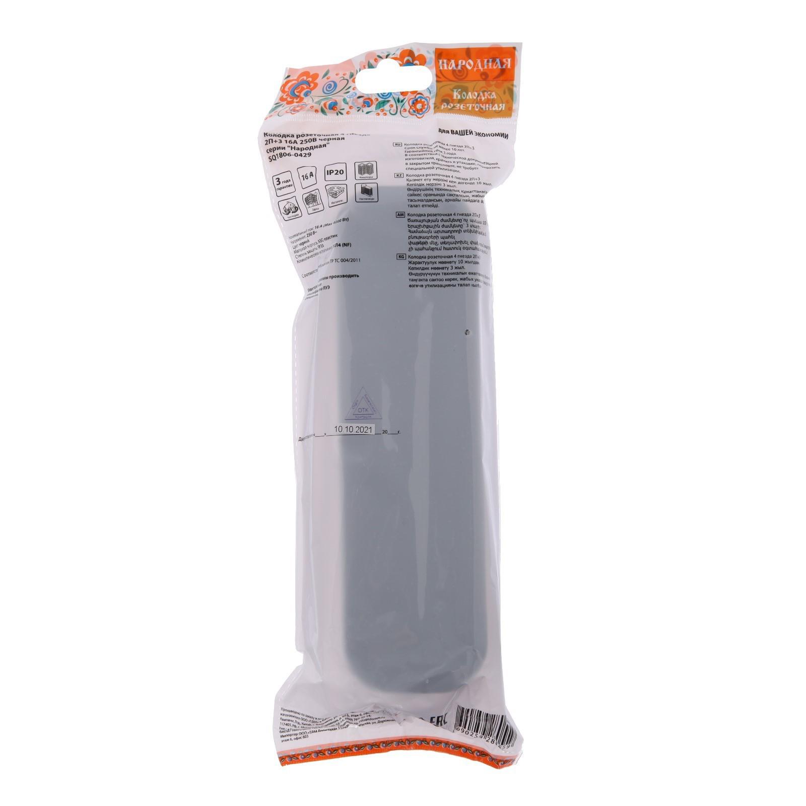 Колодка розеточная TDM "Народная" 4-местная, с/з, 16 А, черная, SQ1806-0429