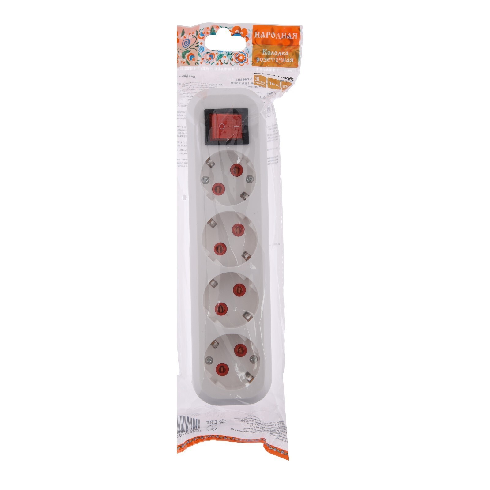 Колодка розеточная TDM "Народная" 4-местная, с/з, с выключателем, 16 А, белая, SQ1806-0421