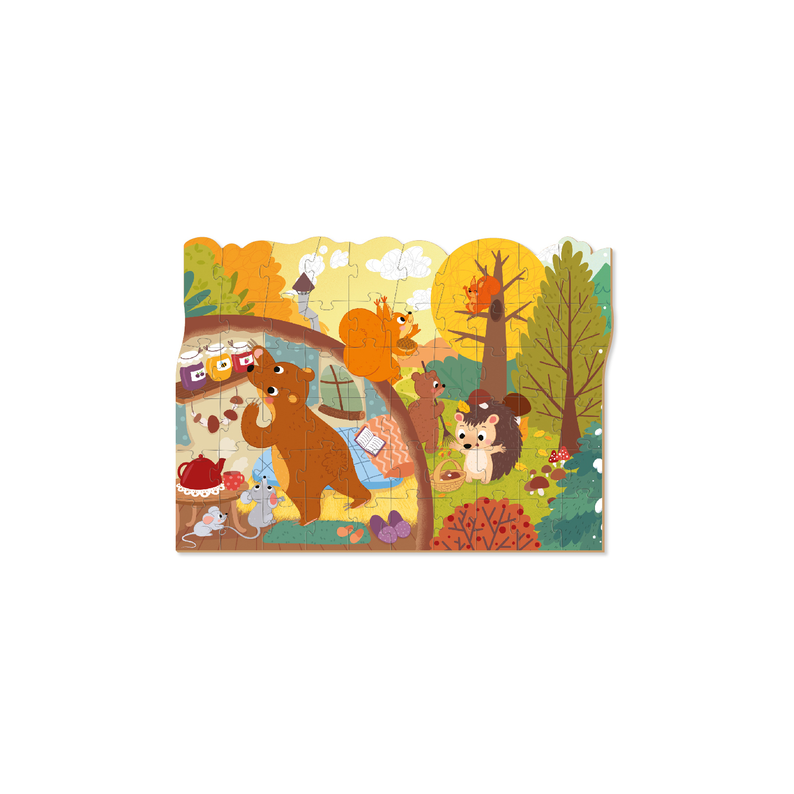 Настає осінь. Дерева вкриваються золотом, збирають останній врожай, а медведик починає готуватися до сплячки. Він запасається варенням, прибирає у своєму барлогу та заварює запашний чай. Робимо навколишній світ чарівнішим за допомогою серії «Пори року», які стануть фаворитами маленьких фантазерів. Яскраві пазли для дітей від 4-х років, розповідають історії пригод милих тваринок. Зберіть всі чотири пазли серії, щоб скласти їх у єдину картинку! Виготовлені з якісного картону, вони довговічні, приємні на дотик та зручні у використанні.