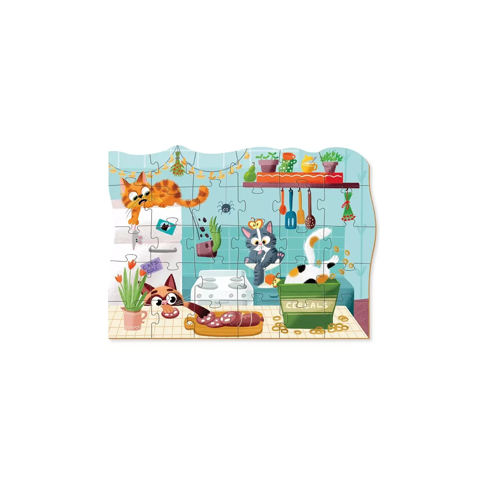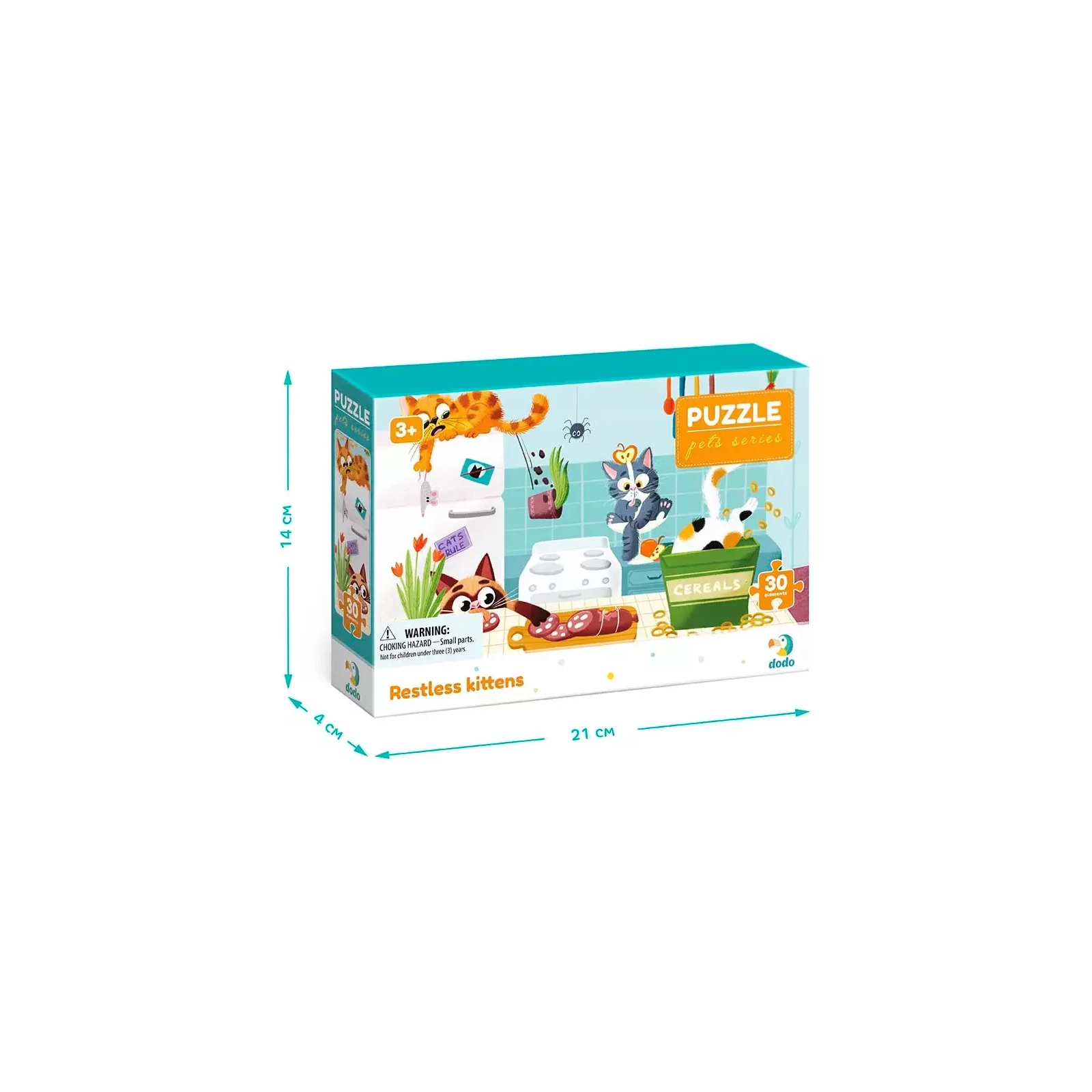 Що відбувається, якщо залишити на самоті команду маленьких, пустотливих кошенят? Багато веселощів, звичайно! Не забудь тільки приховати речі, що легко розбиваються. Пригоди веселих пухнастиків з серії «Домашні улюбленці» швидко розважать малечу. Зберіть усі чотири пазли та складіть єдину, веселу картинку. Виготовлені з якісного картону, пазли довговічні, приємні на дотик та зручні у використанні. Підходить для дітей від 3-х років, допомагає їм розвивати дрібну моторику, координацію та просторове мислення.