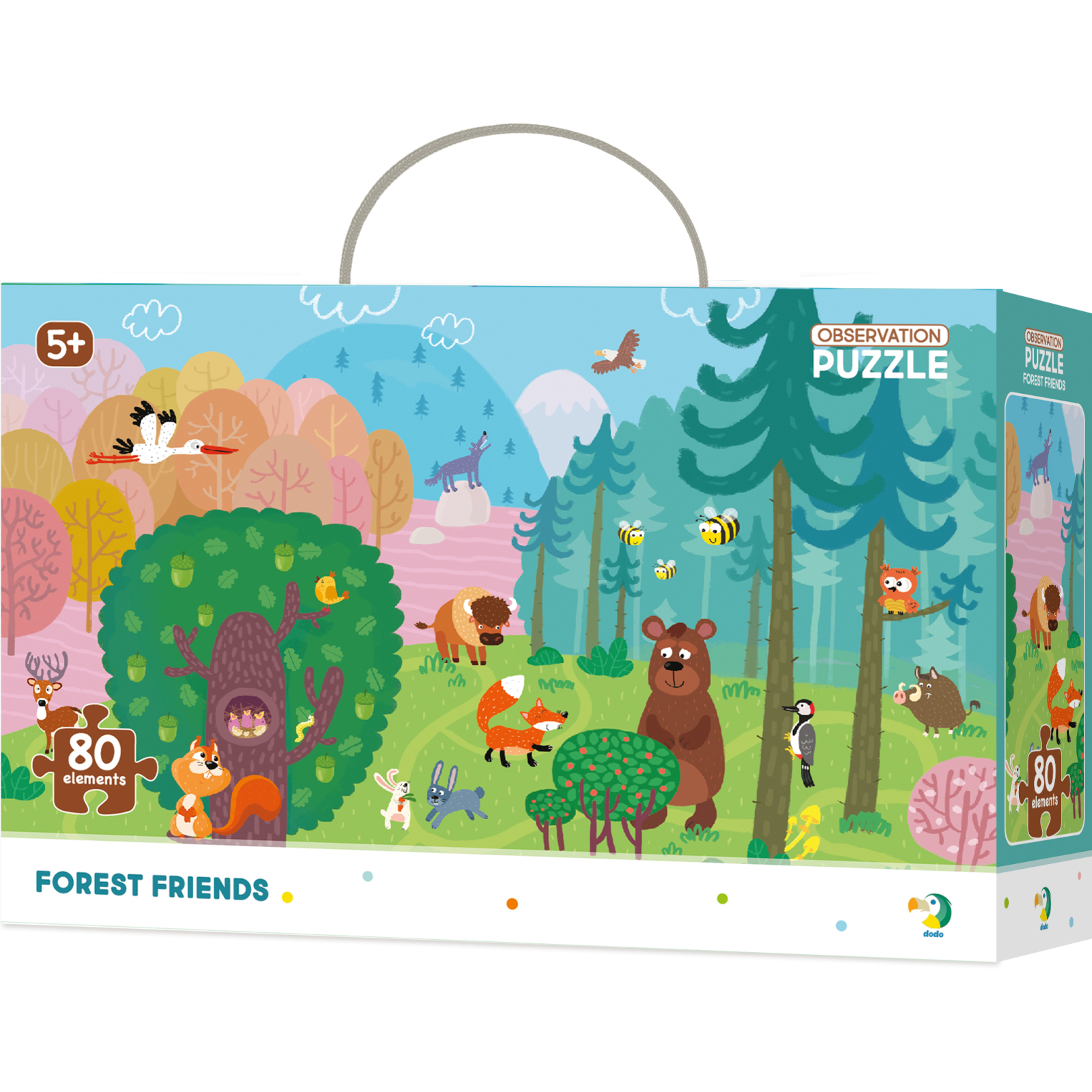 Скільки цікавого відбувається у лісі! Пташки співають, ведмедик шукає, де бджілки сховали свій мед, вовчик кличе своїх друзів погратися. А що бачите ви на цьому пазлі? Особливість обсерваційного пазла — кольорова рамка, на якій зображені елементи пазлу. Задача дитини — знайти картинки з рамки на великому пазлі. Гра з таким пазлом вчить малечу увазі до деталей та швидкості реакції.
