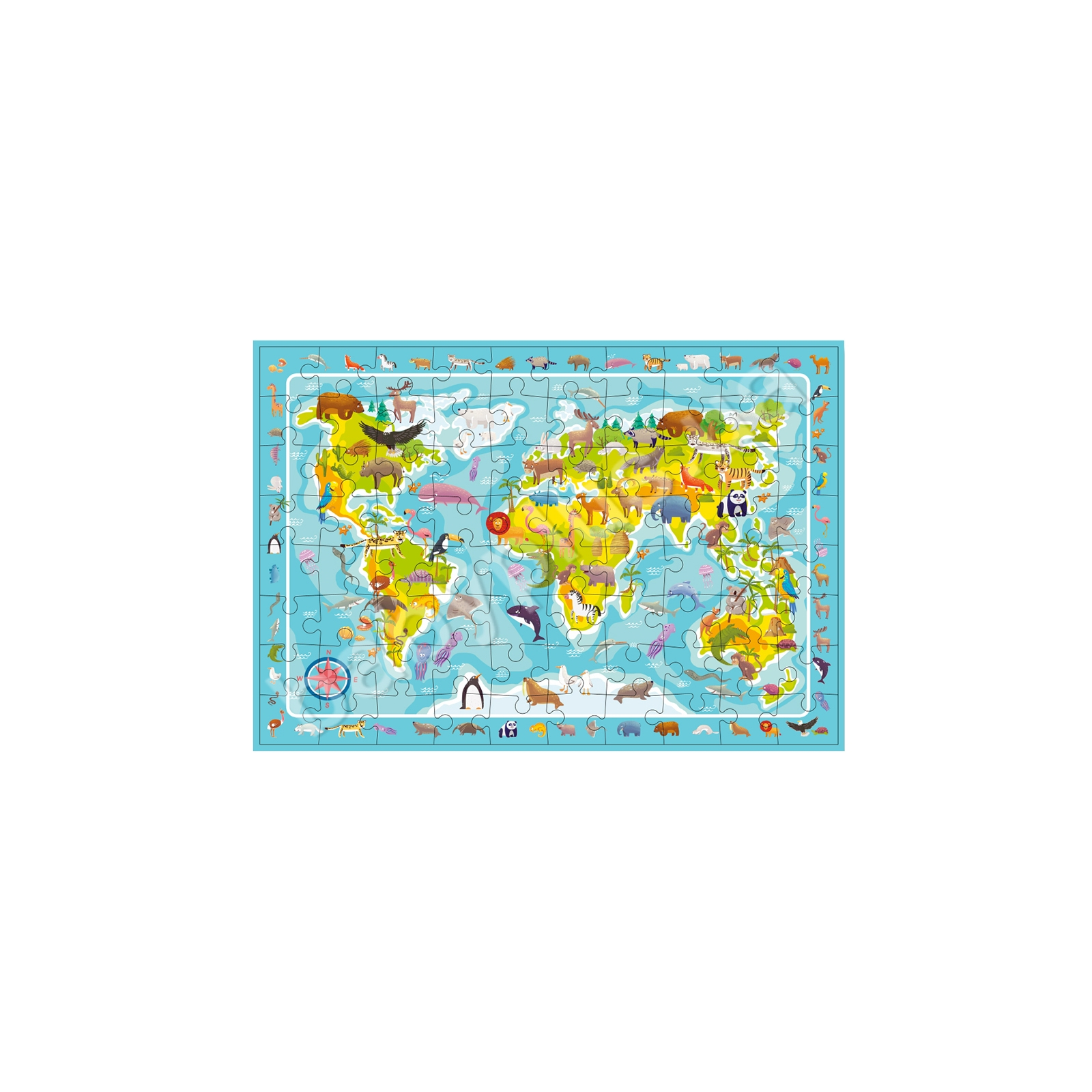 Мало пазлів з картами не буває, тож дивіться на одного з наших фаворитів — з милими тваринками. Діти зможуть вивчити континенти та дізнаватися більше про живий світ. Наприклад, чи знаєте ви, які тваринки живуть у Гренландії? Особливість обсерваційного пазла — кольорова рамка, на якій зображені елементи пазлу. Задача дитини — знайти картинки з рамки на великому пазлі. Гра з таким пазлом вчить малечу увазі до деталей та швидкості реакції.