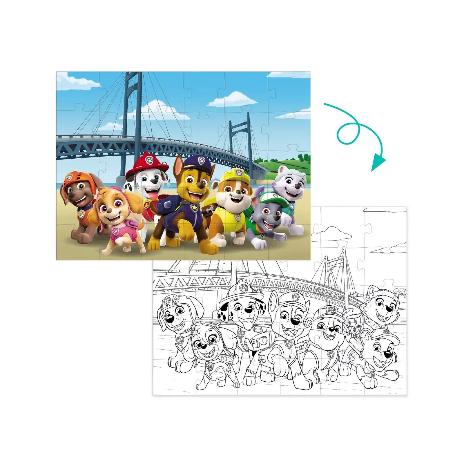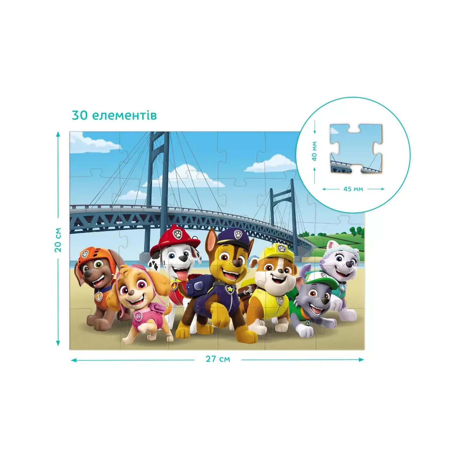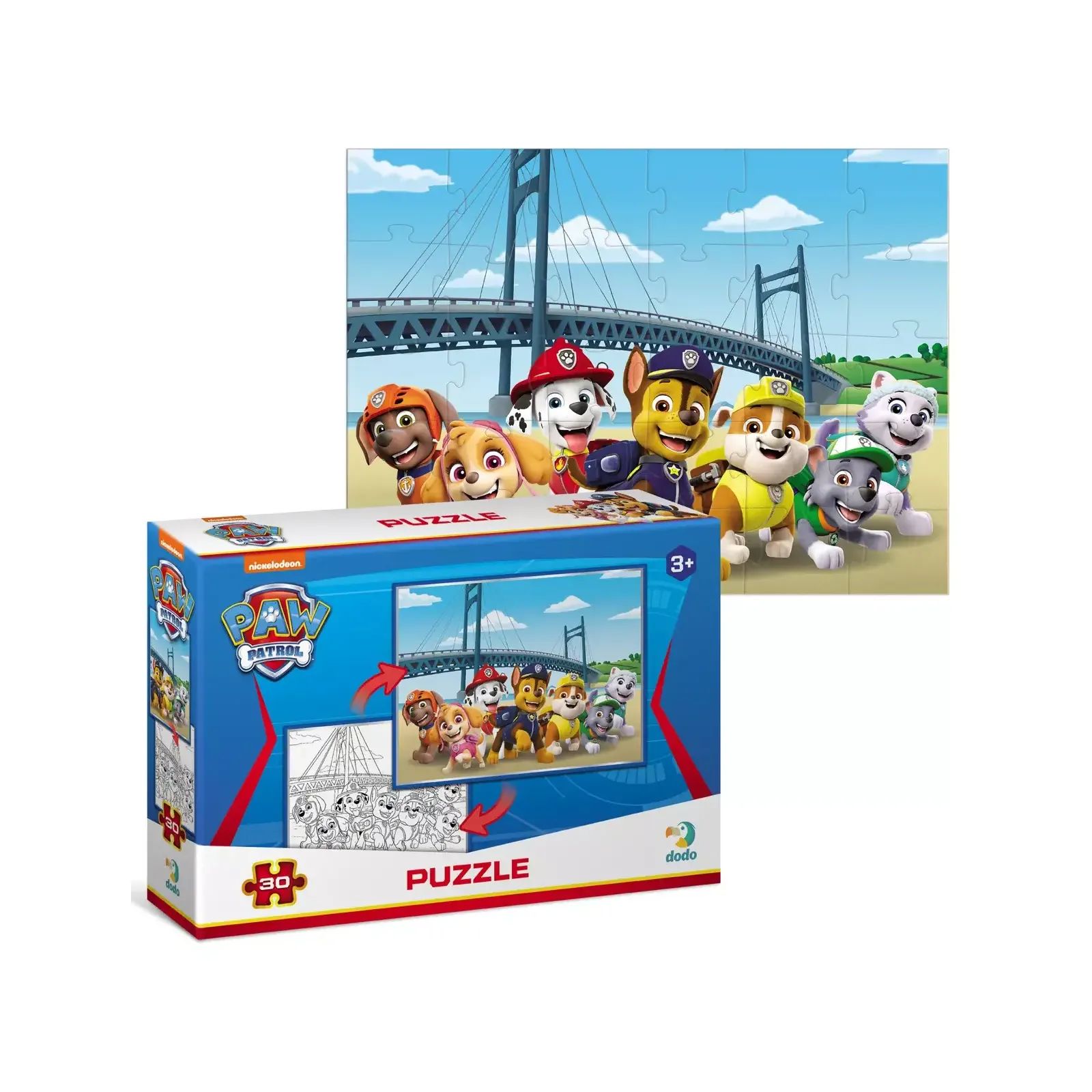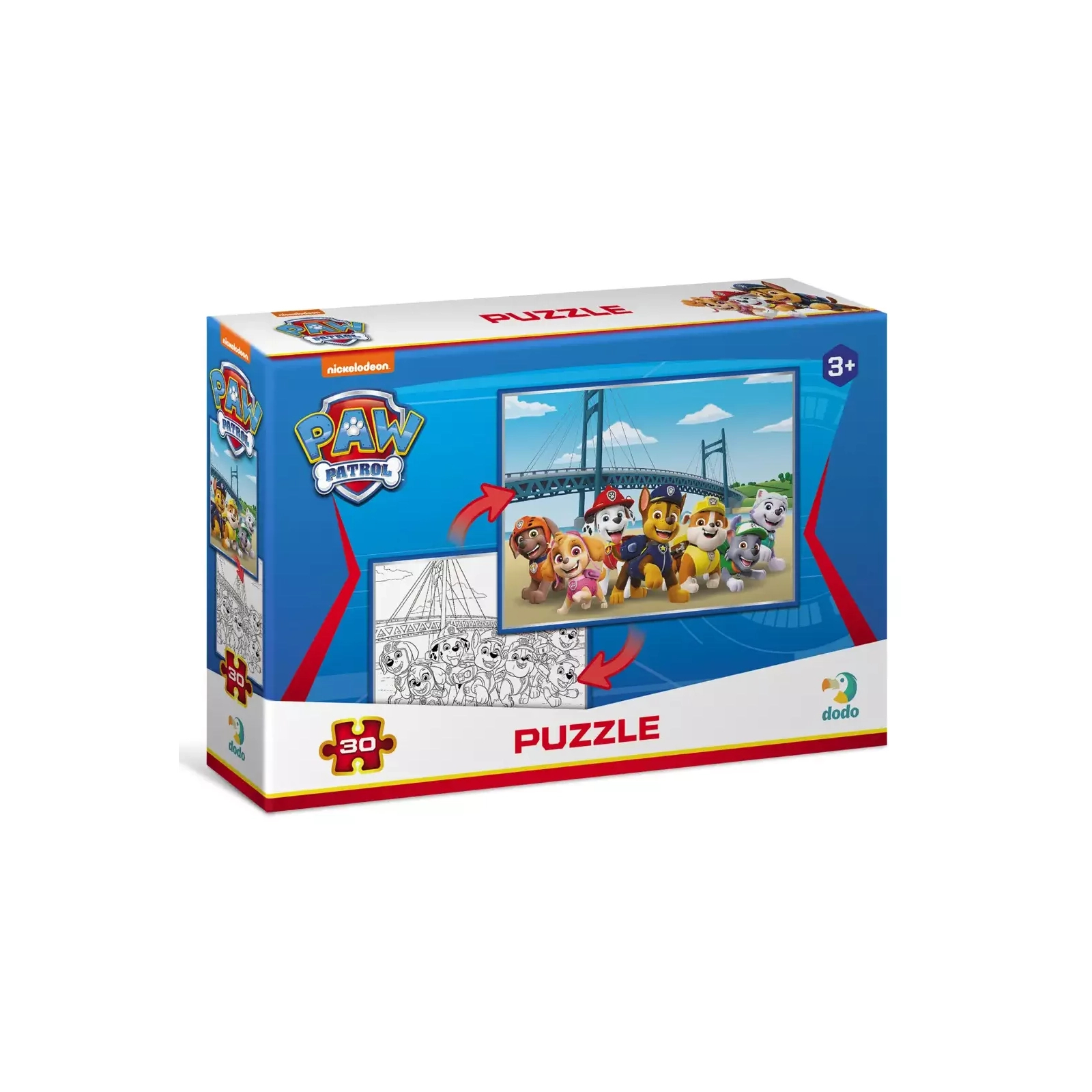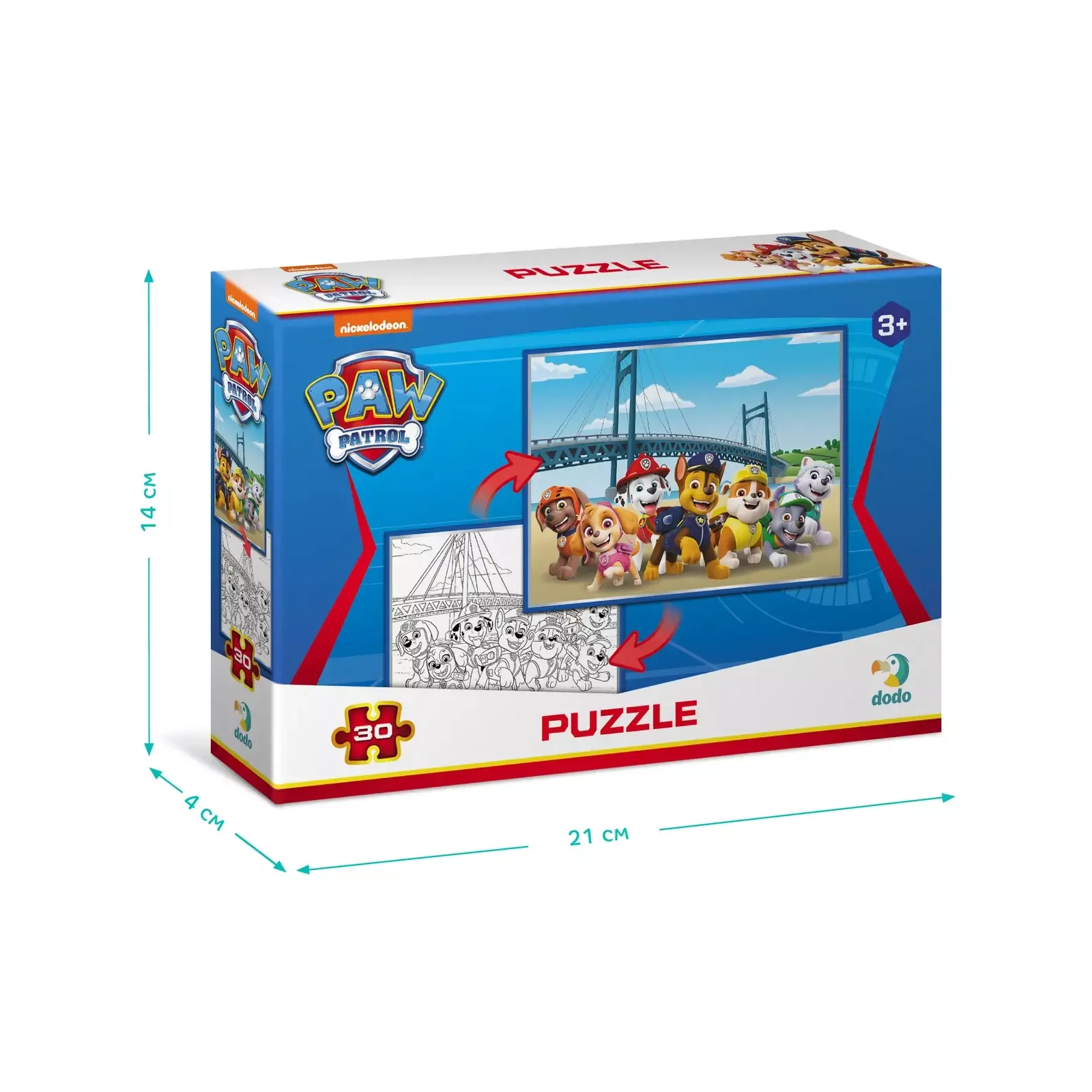 Цуценята які готові до небезпеки. Ця відчайдушна команда зробить все, щоб мешканці Бухти Пригод були щасливі. Улюблені персонажі дитячого мультфільму на нових пазлах Dodo. Малята можуть вивчати нові слова, вигадувати історії та головне — дізнатися про дивовижні пригоди Щенячого потрулю. І не на звичайному пазлі, а на двосторонньому! Спочатку збери картинку, а потім — розмалюй її. Пазли на 30 елементів розраховані на дітей від 3-х років, вони яскраві, виконані з цупкого картону та зручні у грі.