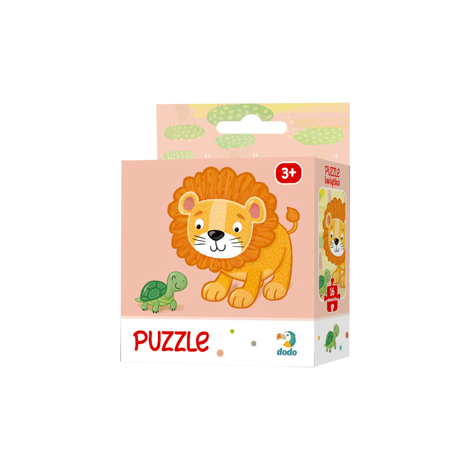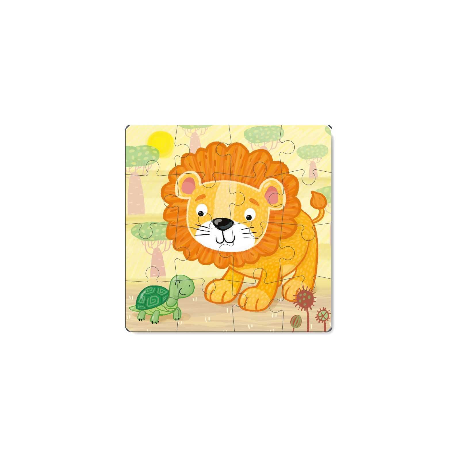 Пухнасте левеня відправляється у подорож саваною разом із черепашкою, своїм найліпшим другом. Збираймо цілий зоопарк у себе вдома — цуцик, левеня, жирафа, кошеня і багато інших тваринок у серії на 16 елементів. Мальовничі картинки захоплюють увагу дитини, а завдяки великим деталям та щільному картону пазл витримає будь-яку гру. Підходить для дітей від 3-х років, допомагає їм розвивати дрібну моторику, координацію та просторове мислення.