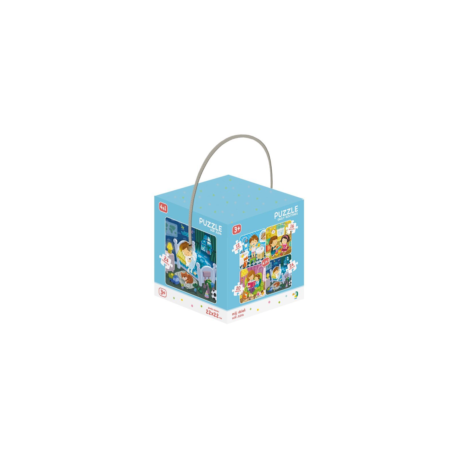 Спочатку ми чистимо зубки, потім — вчимося та граємо, а наприкінці дня приходить час сну. Вивчаємо розпорядок дня за допомогою пазла 4в1 «Мій день». Бо що може бути краще за один пазл? Звичайно — чотири пазли у одній коробці! В одному наборі представлено 4 рівня складності пазла: на 12, 16, 20 та 24 елементи, тож гру можна ускладнювати з часом. Підходить для дітей від 3-х років, допомагає їм розвивати дрібну моторику, координацію та просторове мислення.