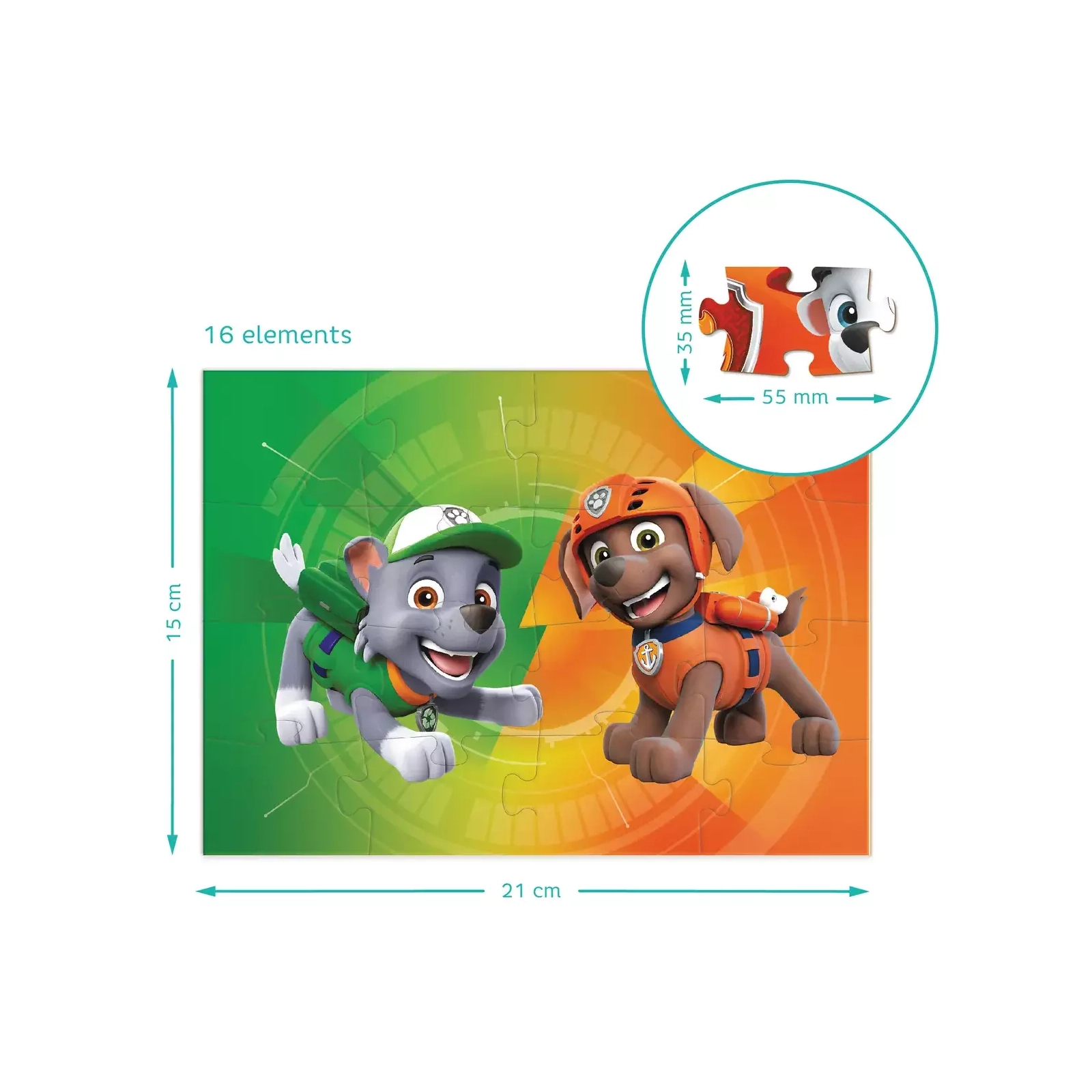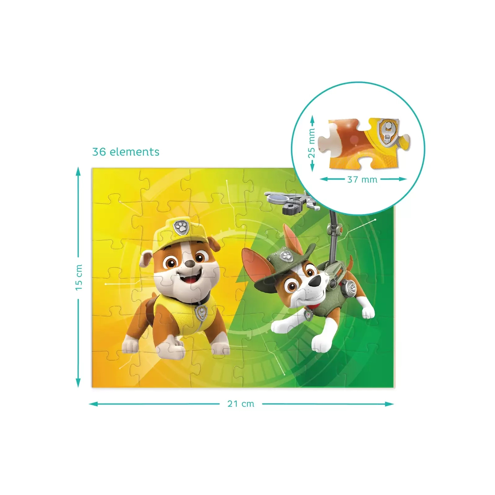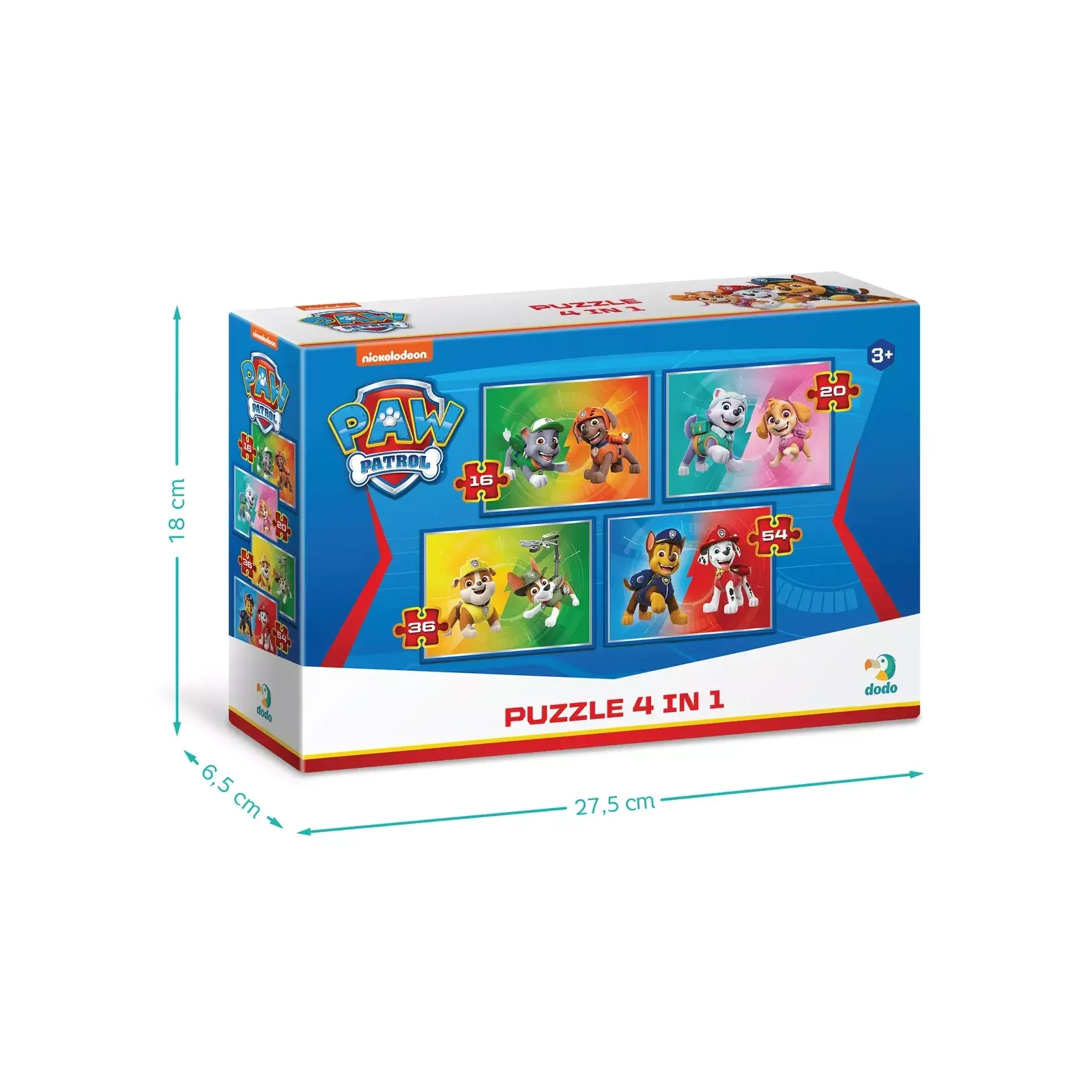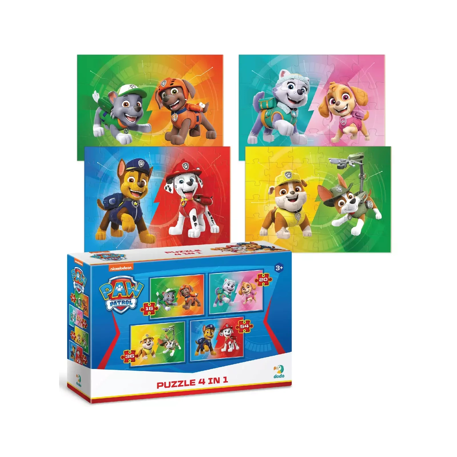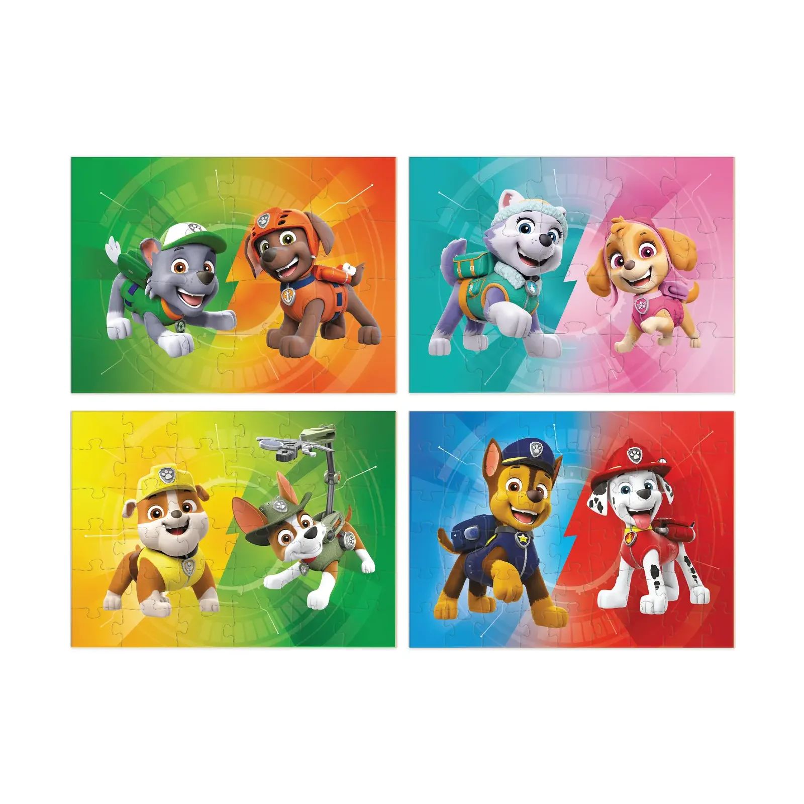 Всіма улюблені цуцики-рятувальники зі "Щенячого потруля" отримали власні пазли. Кожен з них зображує одного з відчайдушних цуциків. А хто улюбленець ваших малят? Що може бути краще ніж один пазл? Чотири пазли в одній коробці, звичайно! Розроблені спеціально, щоб ставати складнішими з часом, у наборі три пазли: на 16, 20, 36 та 54 елементи. І всі вони зображують улюблених персонажів “Paw Patrol”.