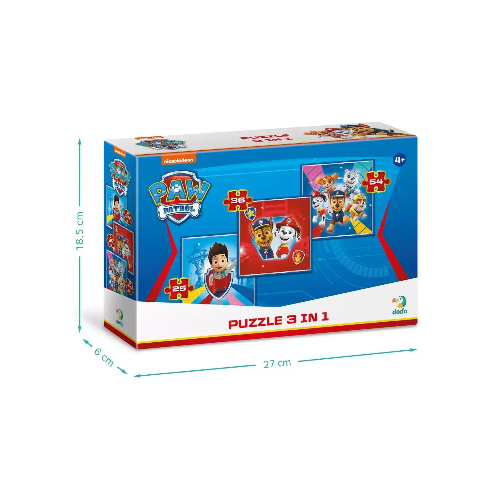 Улюлені персонажі з мультфільму про пригоди цуциків-рятувальників зі "Щенячого патруля" на яскравих пазлах від Dodo! Що може бути краще ніж один пазл? Три пазли в одній коробці, звичайно! Розроблені спеціально, щоб ставати складнішими з часом, у наборі три пазли: на 25, 36 та 54 елементи. І всі вони зображують улюблених персонажів Paw Patrol.