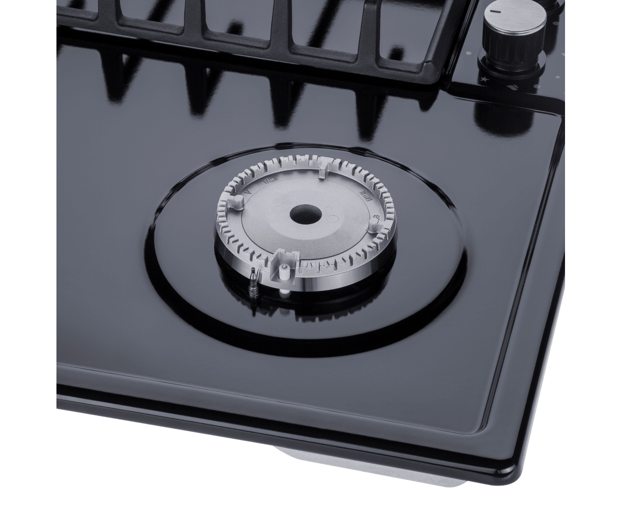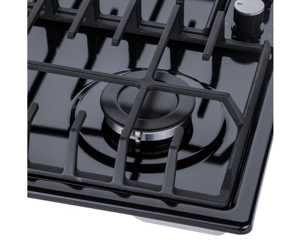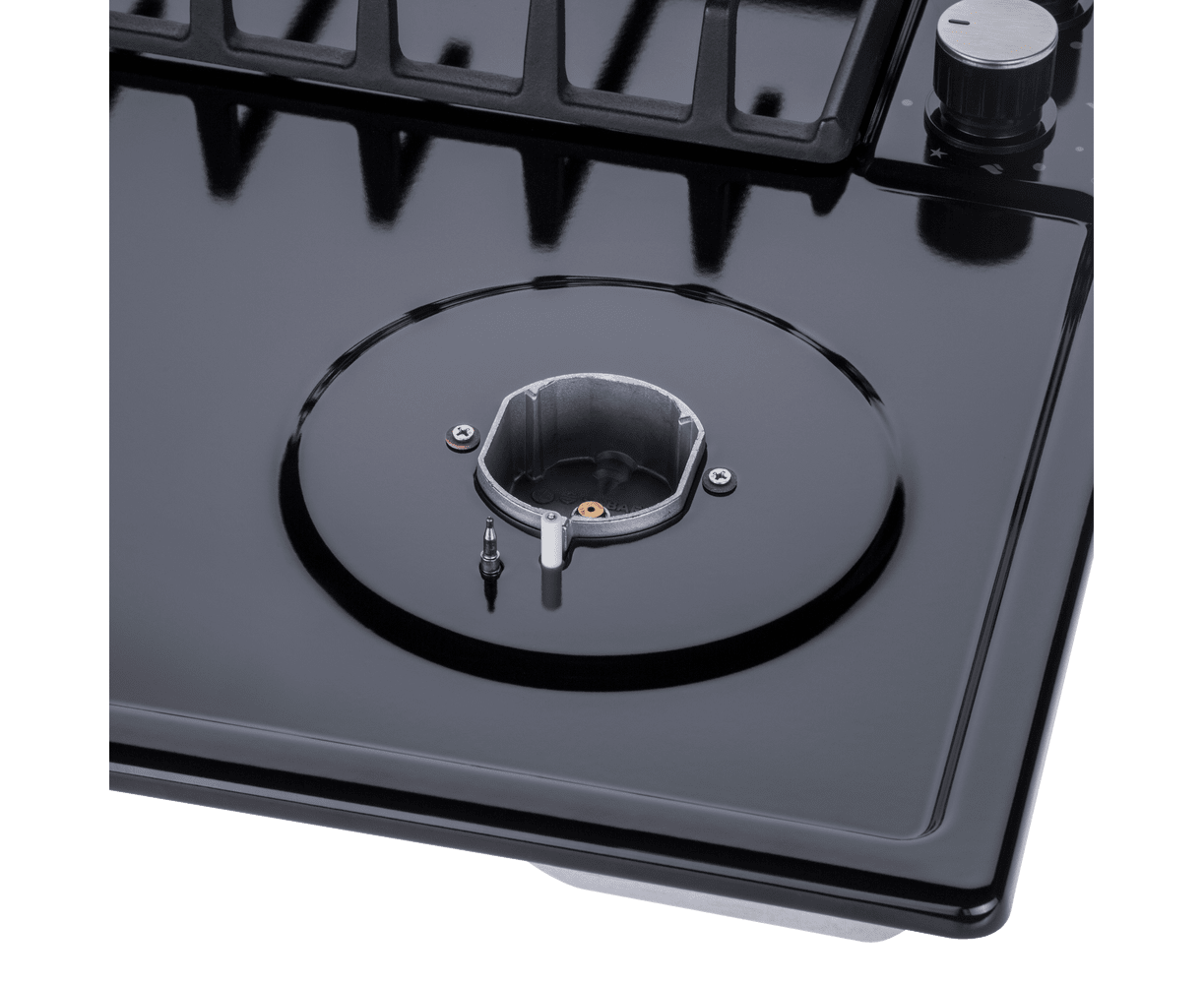 Панель выполнена из металла, покрытого термостойкой прочной эмалью черного цвета. Четыре стандартные итальянские конфорки SABAF мощностью 1000 Вт, 1700 Вт, 1700 Вт и 2600 Вт спроектированы таким образом, что огонь не перегревает ни чугунные решетки, ни ручки управления.