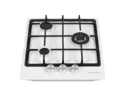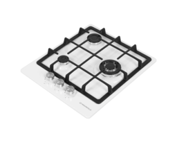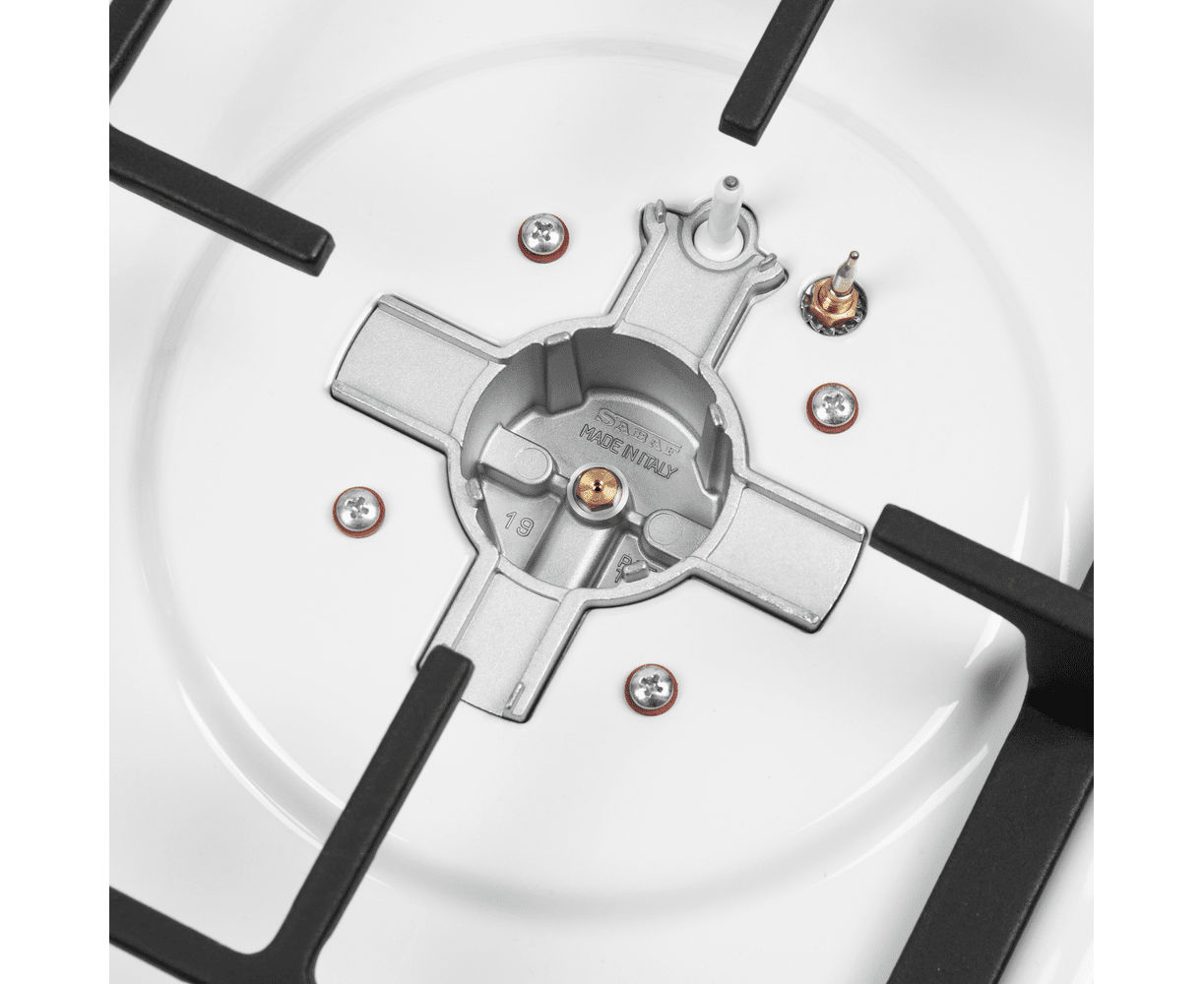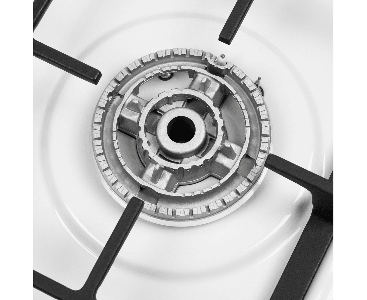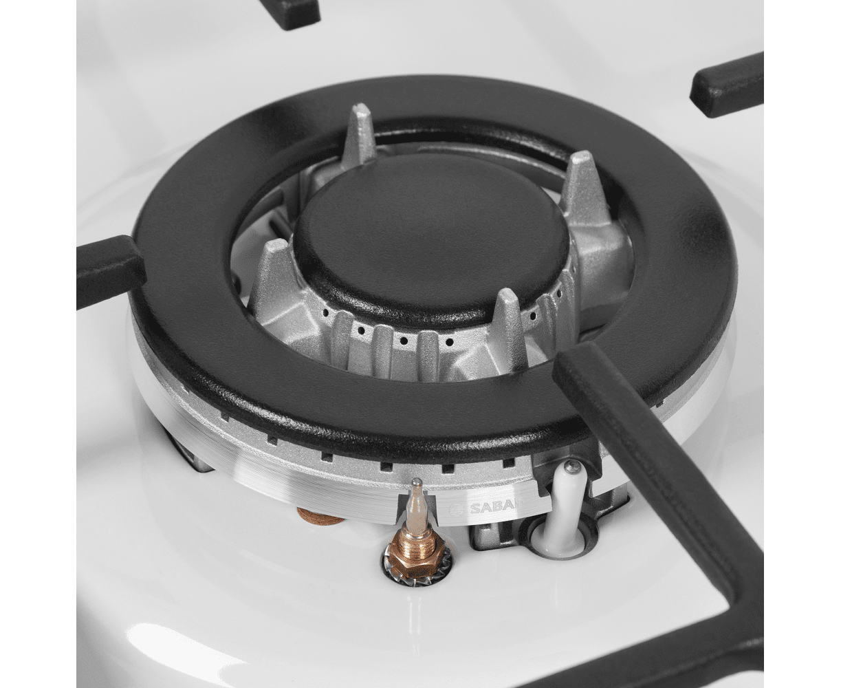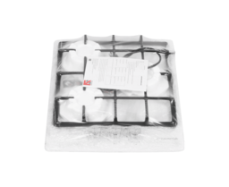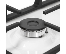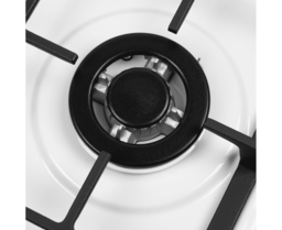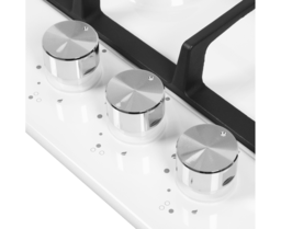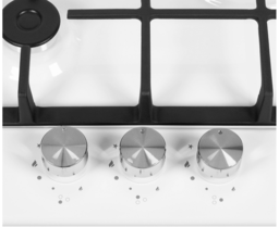 Панель выполнена из закаленного стекла белого цвета. В данной модели установлены итальянские горелки SABAF (3 конфорки). Две стандартные конфорки мощностью 1000 Вт, 1700 Вт и одна мощная WOK-конфорка с двойным пламенем мощностью 3000 Вт. Они спроектированы таким образом, что огонь не перегревает ни чугунные решетки, ни ручки управления.