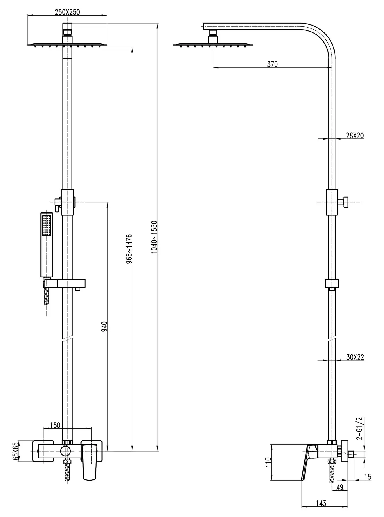 Размеры панели / стойки1040-1550x370 мм
