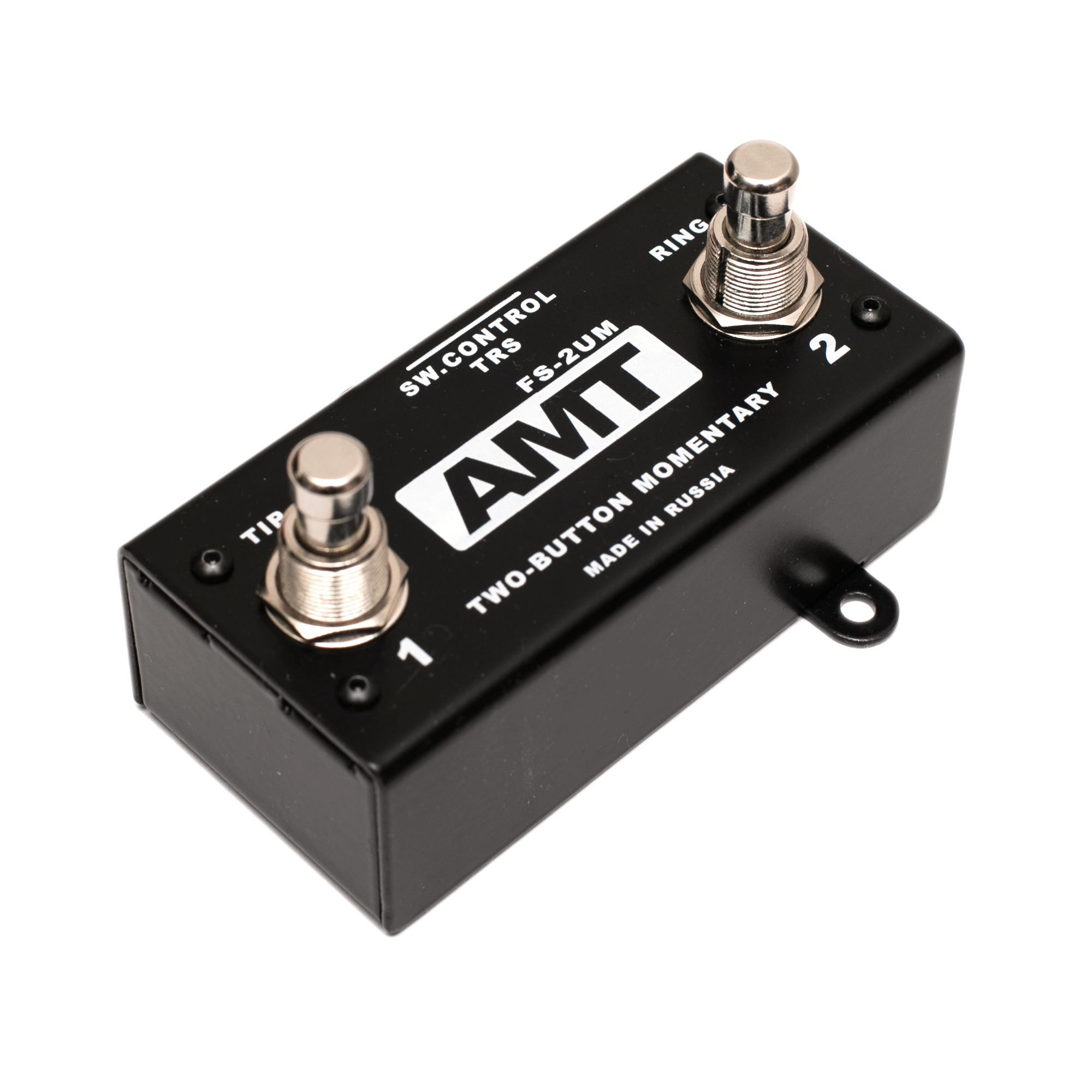 Представляем Вашему вниманию футсвитч AMT FS-2UM с основными габаритными размерами форм-фактора AMT Bricks. Девайс подключается к управляемому устройству стандартным трехпроводным кабелем с разъемом TRS стерео-джек 6, 3 мм либо TRS mini мини стерео-джек 3, 5 мм. В отличии от модели футсвитча FS-2 MOM, в AMT FS-2UM применены БЕСШУМНЫЕ кнопки мягкого нажатия (то есть без щелчка) с функцией отсутствия фиксации.