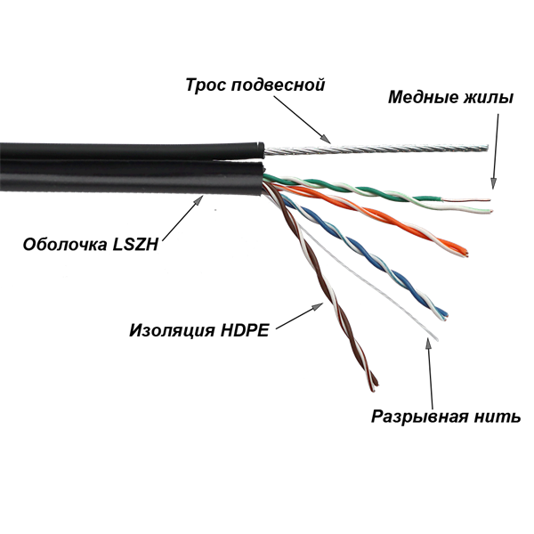 Дополнительная информацияЧетырехпарный кабель UTP имеет следующую конструкцию: Проводник - сплошная медная жила диаметром 24AWG имеет изоляцию HDPE (полиэтилен высокой плотности). Два проводника составляют одну витую пару, в целом же, кабель состоит из четырех пар, скрученных с различным, специально подобранным шагом. В конструкции подвесных кабелей используется многожильный стальной трос состоящий из 7 стальных проволок диаметром 0.5 мм, оболочка троса соединена с оболочкой кабеля, образуя "восьмерку". Кабель с тросом предназначен для подвеса на воздушных линиях связи. На оболочке кабеля нанесены последовательные метровые метки длины.