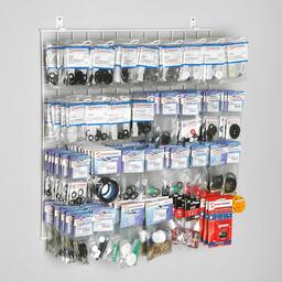 Благодаря компактной упаковке и плотной выкладке на площади 0,36 м² удалось разместить 31 артикул наиболее востребованной продукции. Ассортимент подобран исходя из повседневных нужд, которые возникают при мелком ремонте сантехнических приборов или элементов систем водоснабжения, отопления и газоснабжения. Если необходимо заменить прокладку, починить смеситель или сифон, устранить течь в резьбовом соединении, установить мойку или повесить водонагреватель, то всё необходимое можно найти на этом стенде.