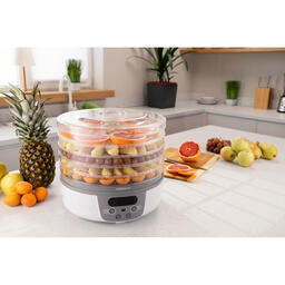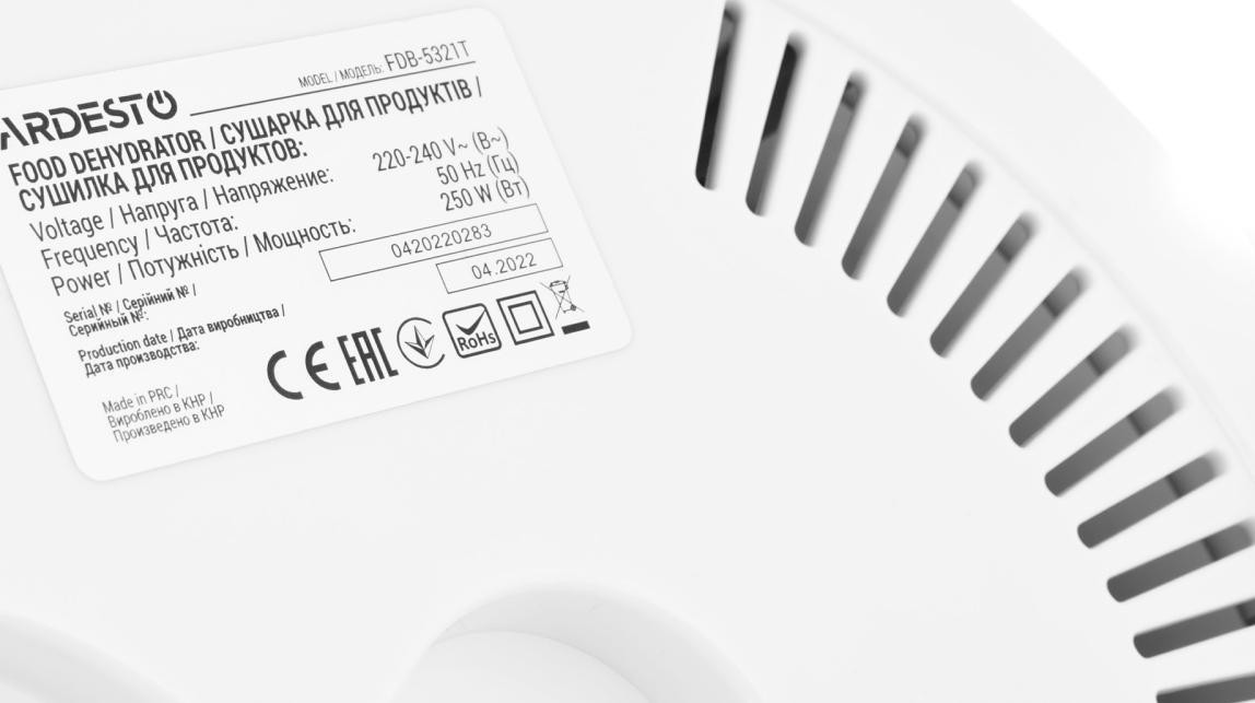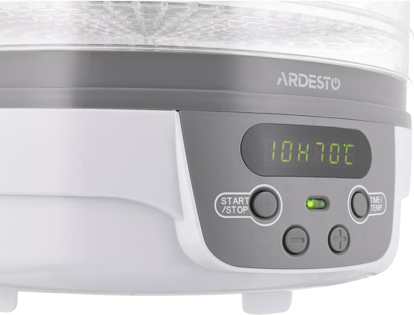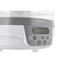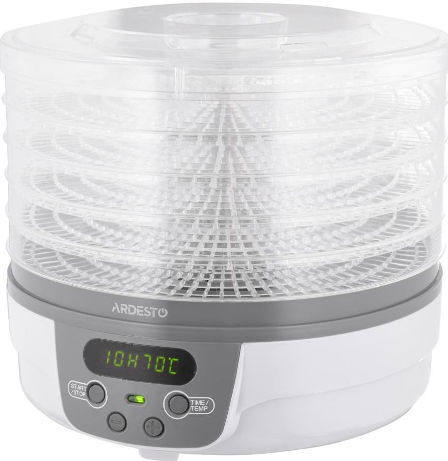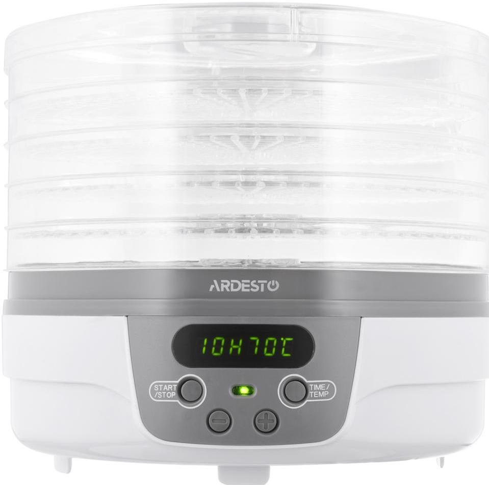 ARDESTO FDB-5321T білого кольору із сірою основою. Її кришка з отворами для повітря та п'ять піддонів діаметром 32 см та висотою 3 см – прозорі, що зручно для стеження за процесом сушіння. Температура сушіння регулюється від 40 до 70°С. Управління – електронне, потужність 250 Вт. На всіх рівнях продукти поступово висушуються із збереженням усіх мінералів та вітамінів. Наявність таймера від 1 до 48 год спрощує процес та економить час.